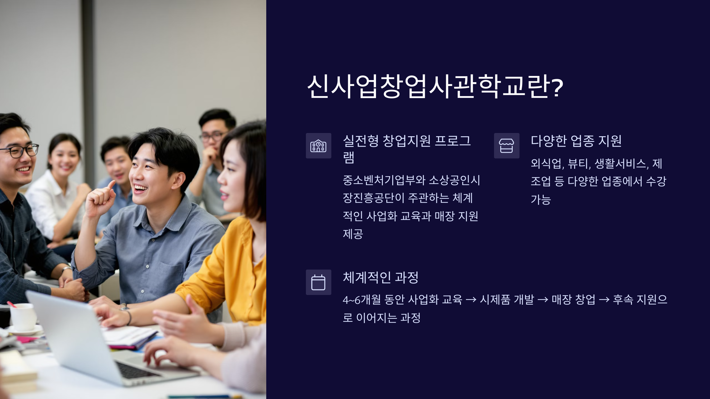 신사업창업사관학교는 중소벤처기업부와 소상공인시장진흥공단이 주관하는 실전형 창업지원 프로그램이에요. 2011년부터 운영되어온 이 제도는 창업을 처음 시작하는 예비창업자들을 대상으로 한 체계적인 사업화 교육과 매장 지원을 제공하죠.