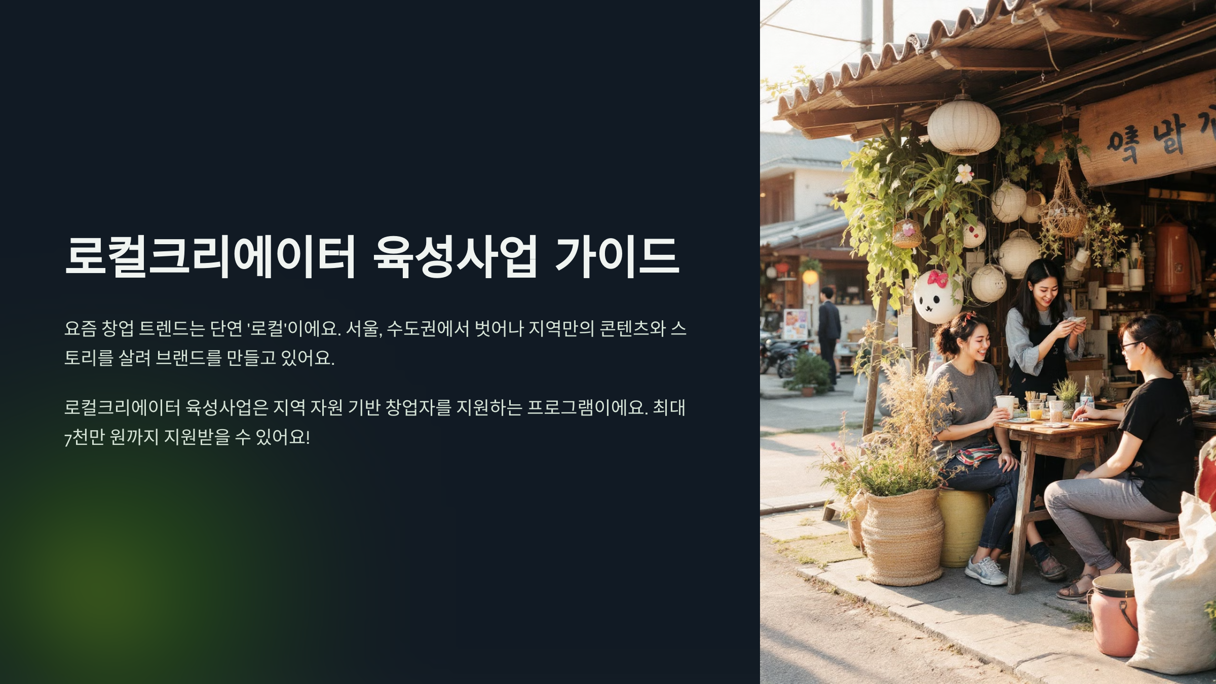 요즘 창업 트렌드는 단연 ‘로컬’이에요. 서울, 수도권 중심에서 벗어나 지역만의 콘텐츠와 스토리를 살려 브랜드를 만들고, 창업으로 연결하는 흐름이 점점 커지고 있어요. 바로 여기에 딱 맞는 정부 지원사업이 로컬크리에이터 육성사업이에요! 🌱
