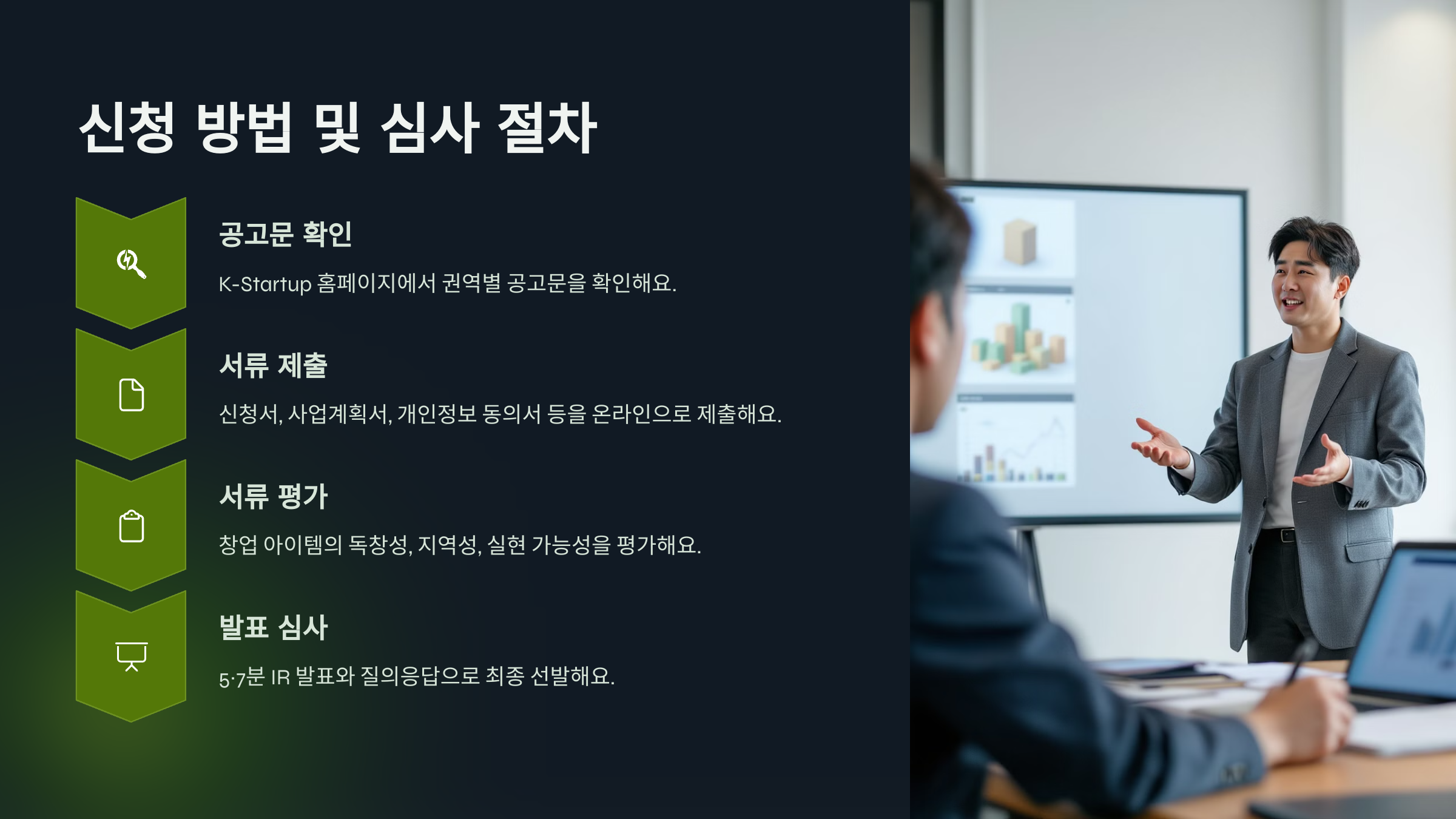 - 발표 심사: 서류 통과자 대상으로 IR 발표(5~7분), Q&A 포함