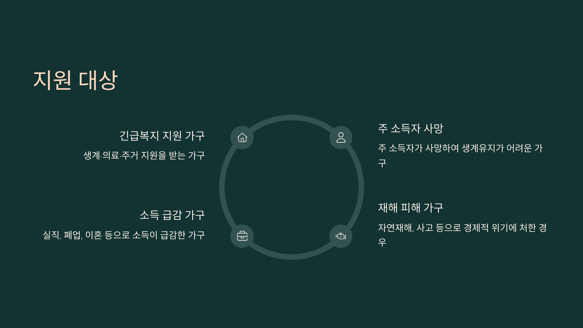- 주 소득자가 사망하여 생계유지가 어려운 가구