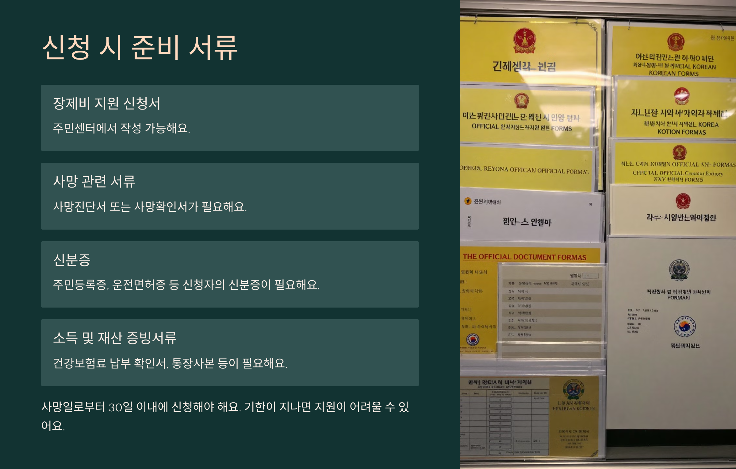 - 장제비 지원 신청서 (주민센터에서 작성 가능)