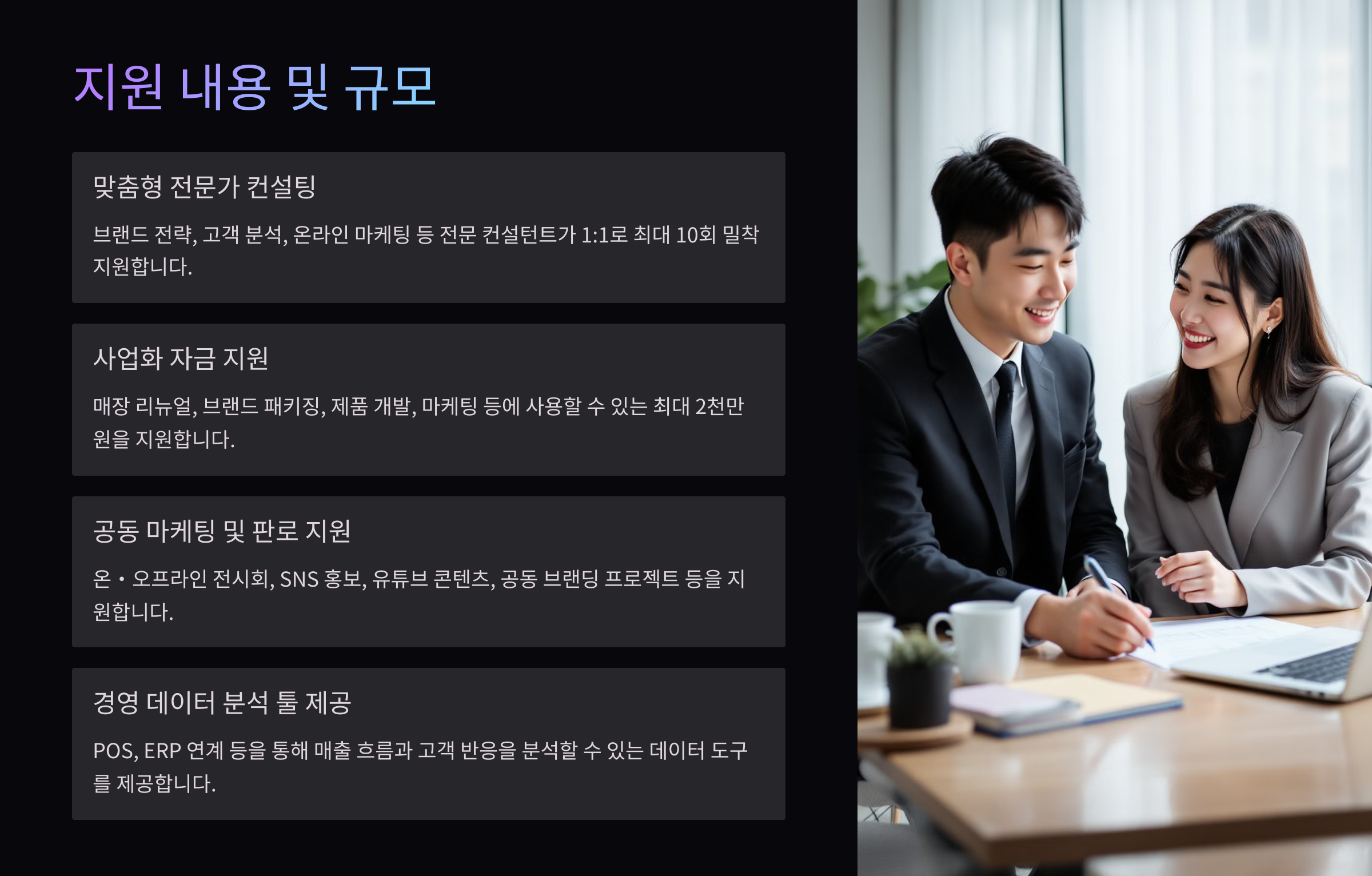 | 전문가 컨설팅 | 경영, 마케팅 등 1:1 밀착 | 최대 10회 |