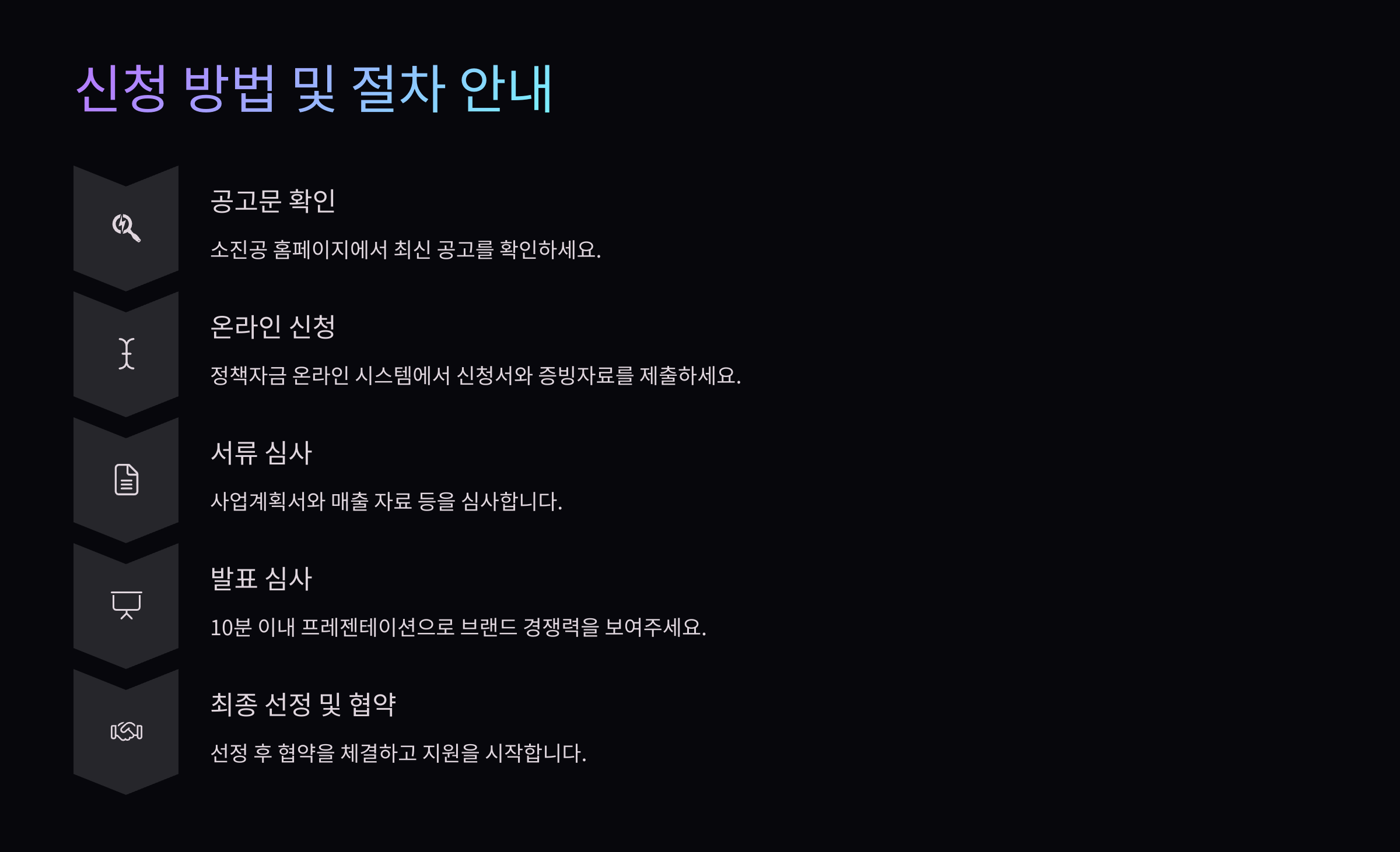 마지막으로 성과 공유 및 결과보고가 있어요. 단순 보고서뿐 아니라, 실사례 중심 발표회, 우수 브랜드 전시회 등에 참여하게 되며, 일부는 추가 정책자금이나 마케팅 연계 사업으로 확장되기도 해요 🚀