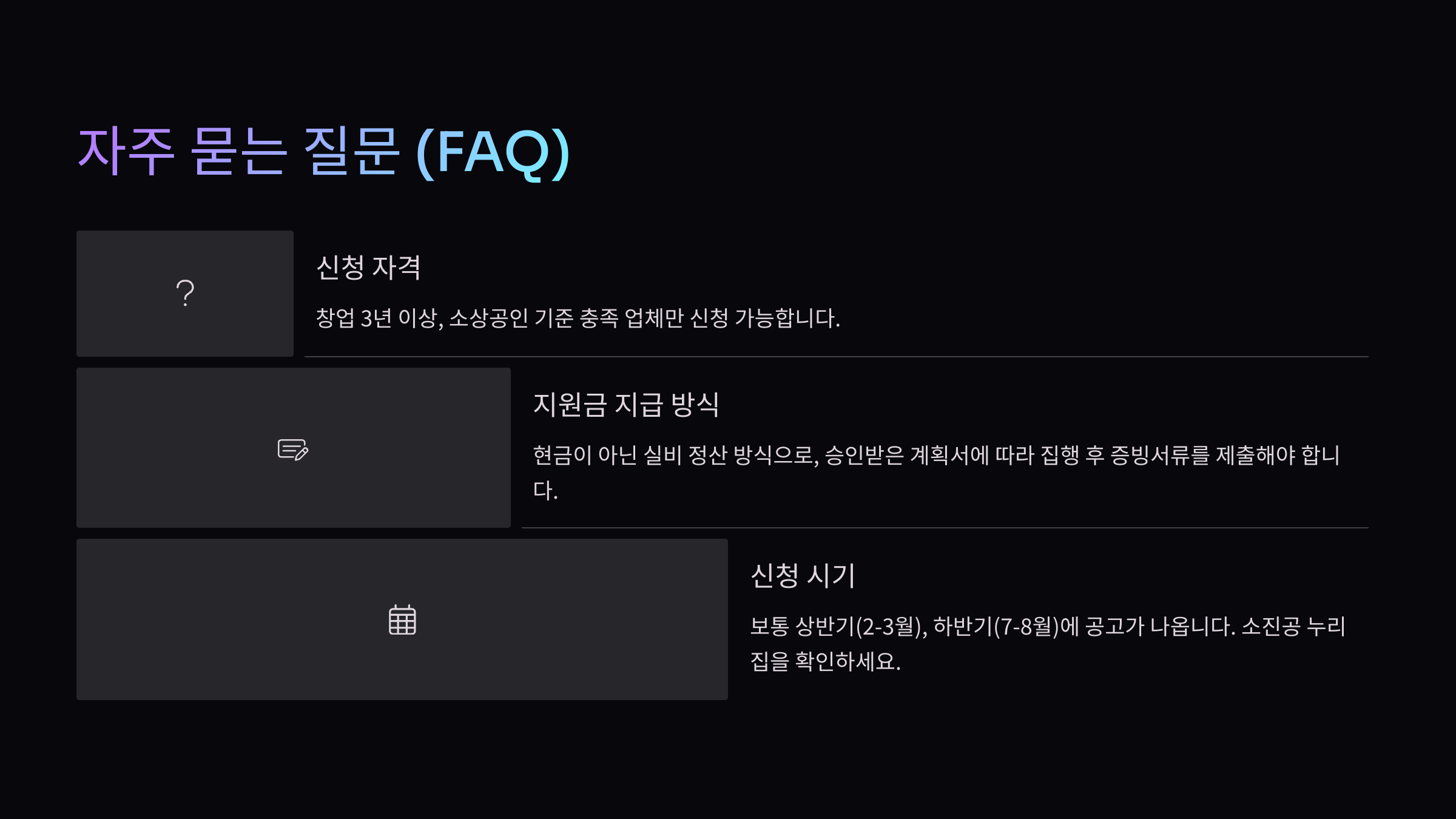 A5. 보통 상반기(2~3월), 하반기(7~8월)에 공고가 나와요. 소상공인시장진흥공단 누리집을 꼭 확인해주세요!