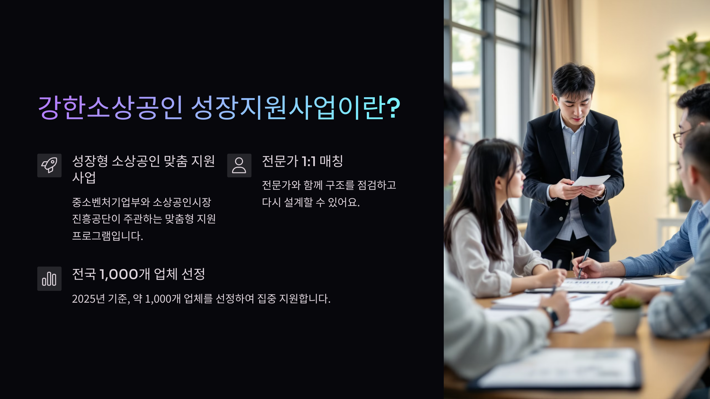 2025년 기준, 이 사업은 약 1,000개 업체를 선정하여 집중 지원하며, 컨설팅과 사업개선 자금, 판로 개척, 공동 마케팅 등 다양한 방식으로 전방위적인 성장을 돕고 있어요. 특히 1:1 전문가 매칭이 큰 장점이에요 👨🏫