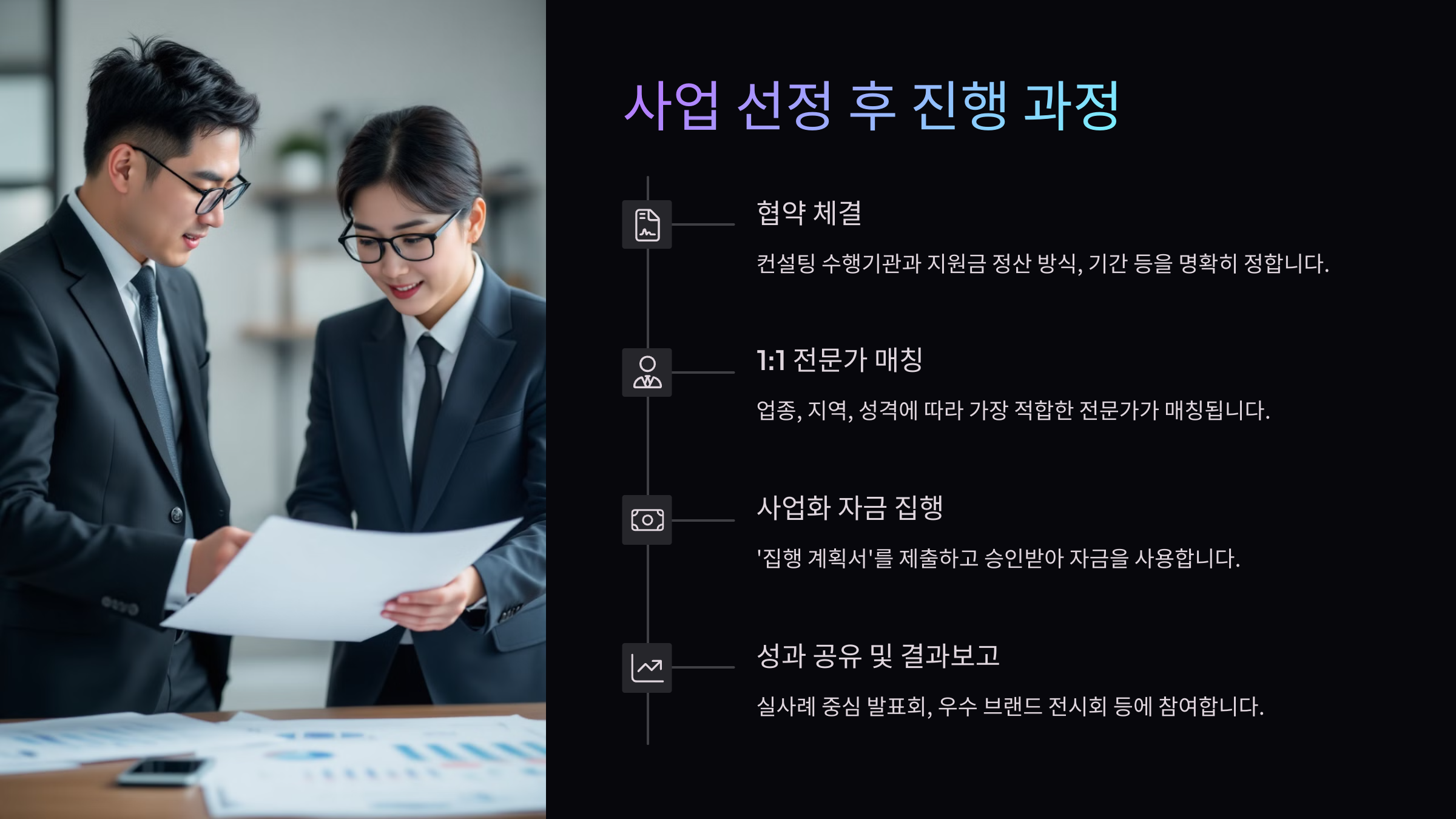 먼저 협약 체결부터 진행돼요. 컨설팅 수행기관과 지원금 정산 방식, 기간 등을 명확히 정하고, 이 과정에서 구체적인 ‘지원 계획서’가 확정돼요. 이때 어떤 영역(마케팅, 리뉴얼 등)에 집중할지를 명시하게 돼요.