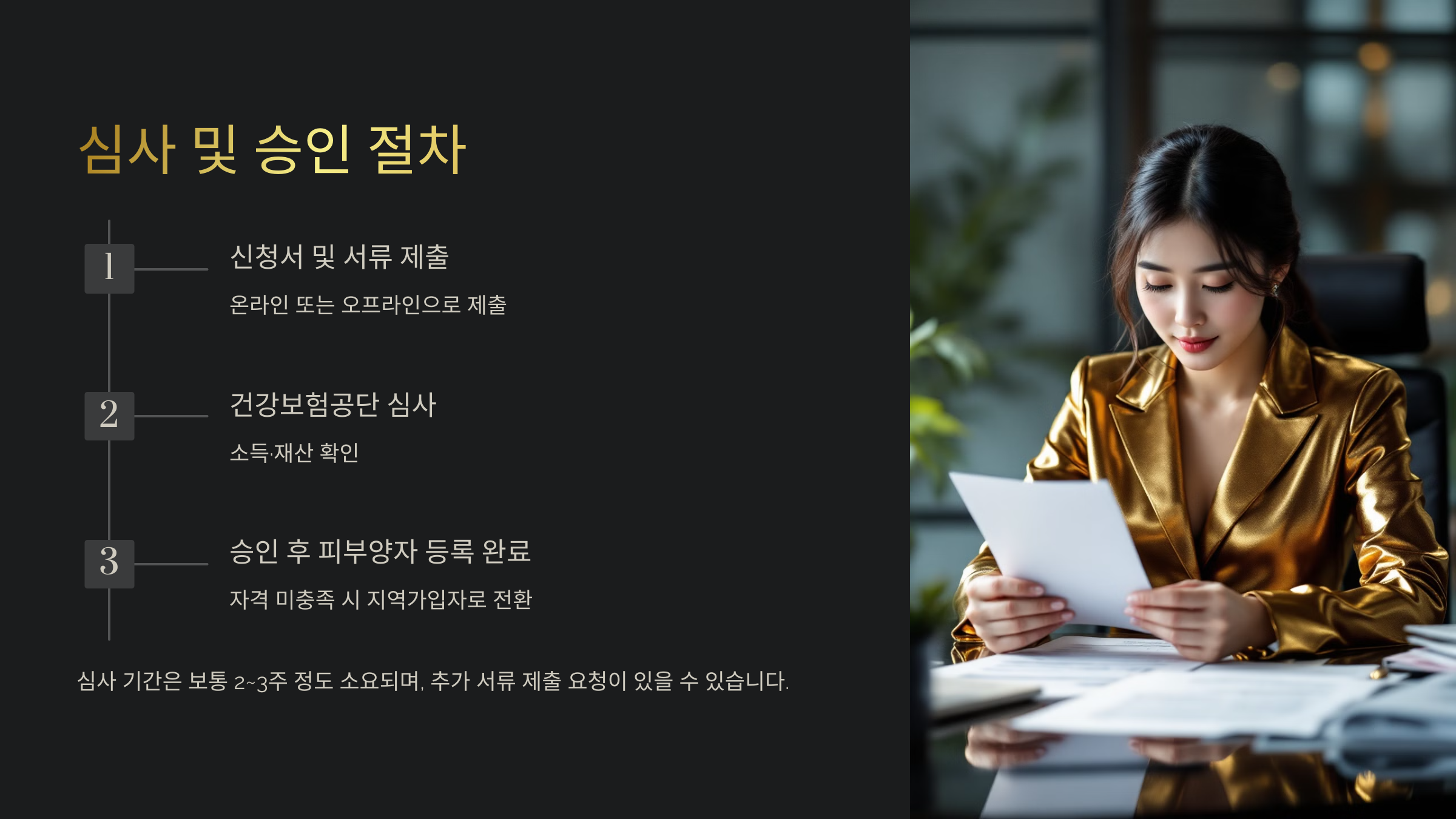 피부양자 등록 신청 후 건강보험공단에서 심사를 진행해요. 심사 결과에 따라 피부양자로 인정되거나 지역가입자로 전환될 수 있어요.