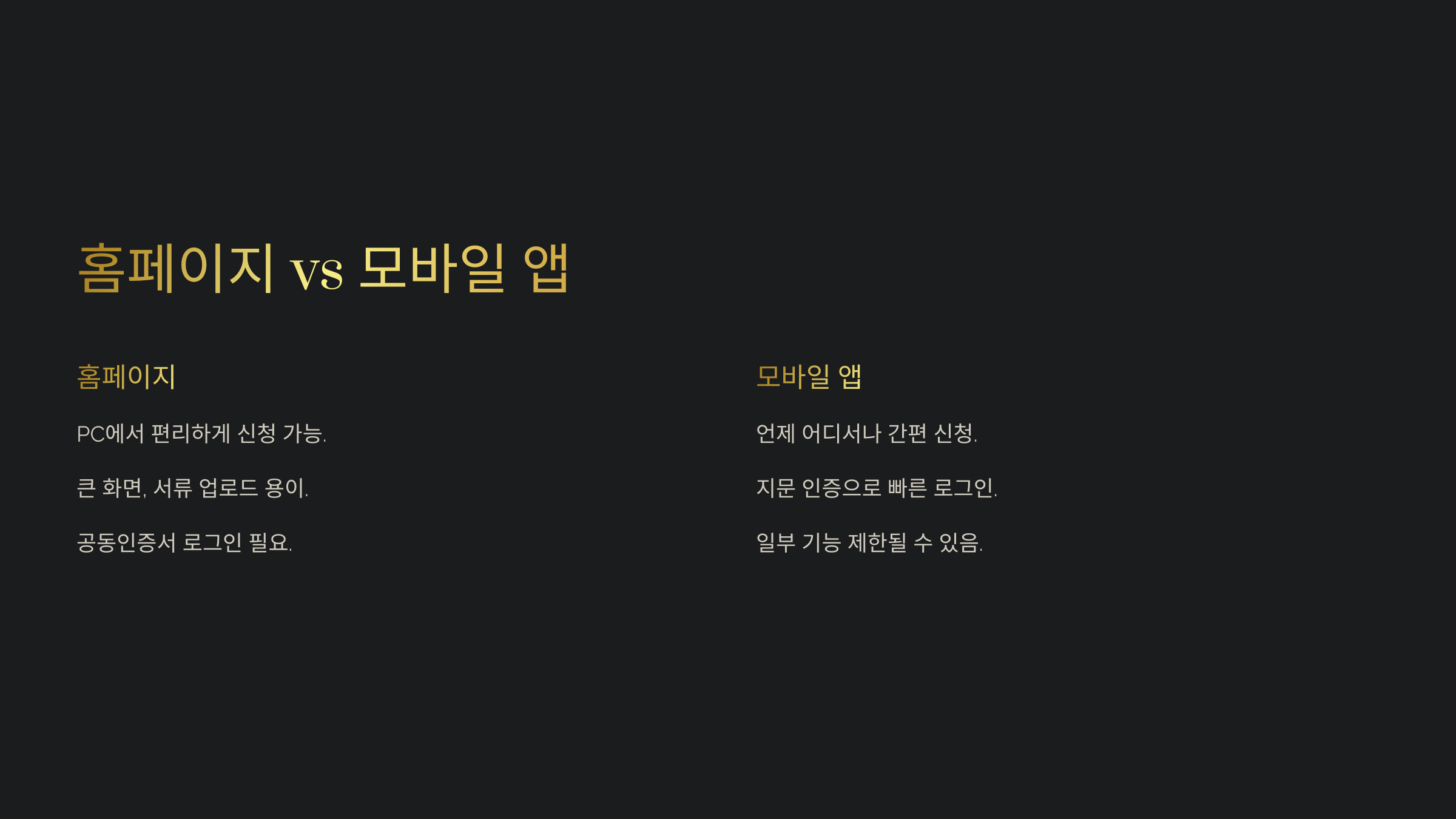 | 로그인 방식 | 공동인증서(구 공인인증서) | 지문 인증 또는 간편 로그인 |