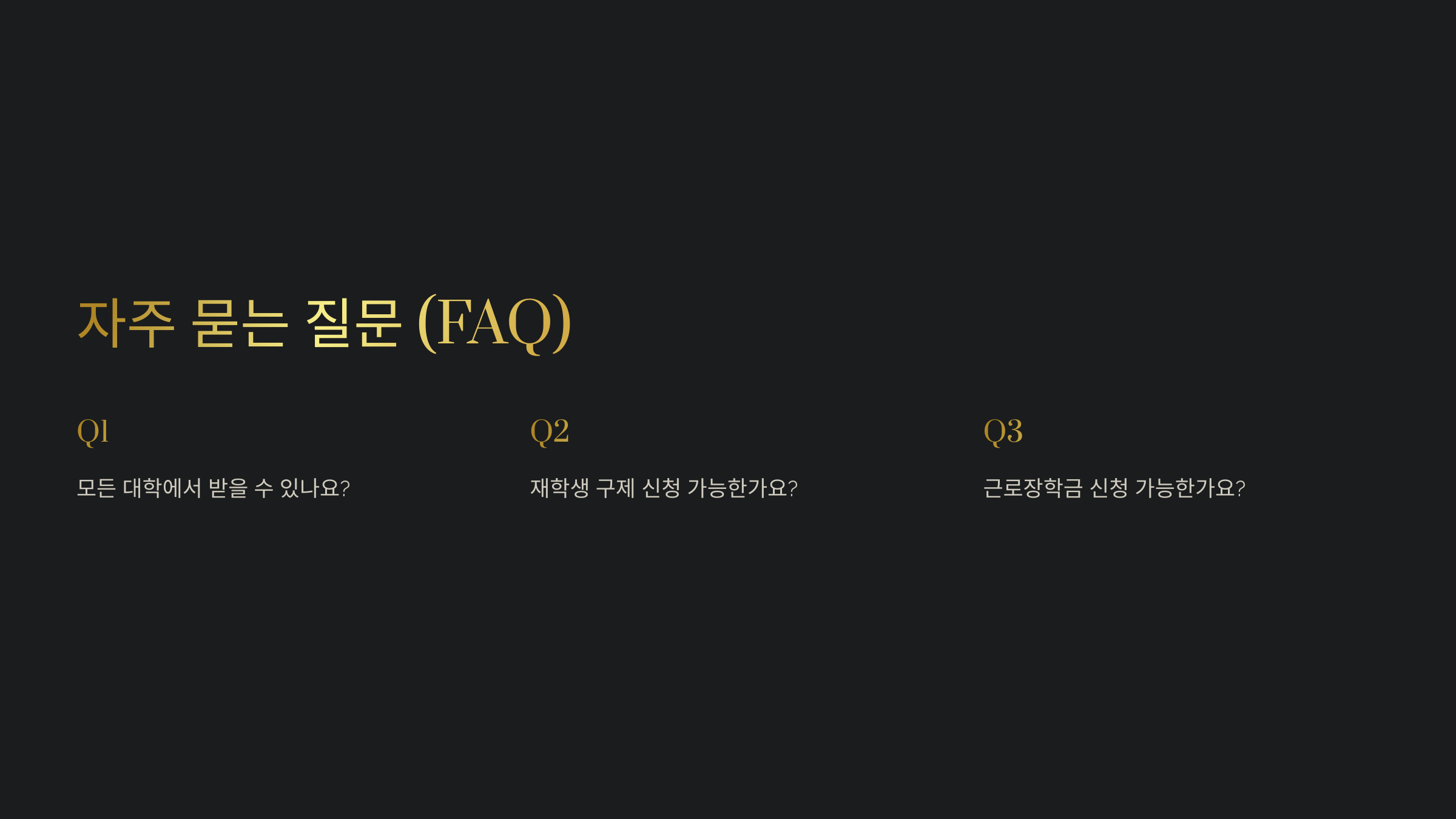 A1. 아니요! 학자금 지원이 가능한 대학에서만 받을 수 있어요. 2025학년도 지원 가능 대학 명단을 확인하세요.