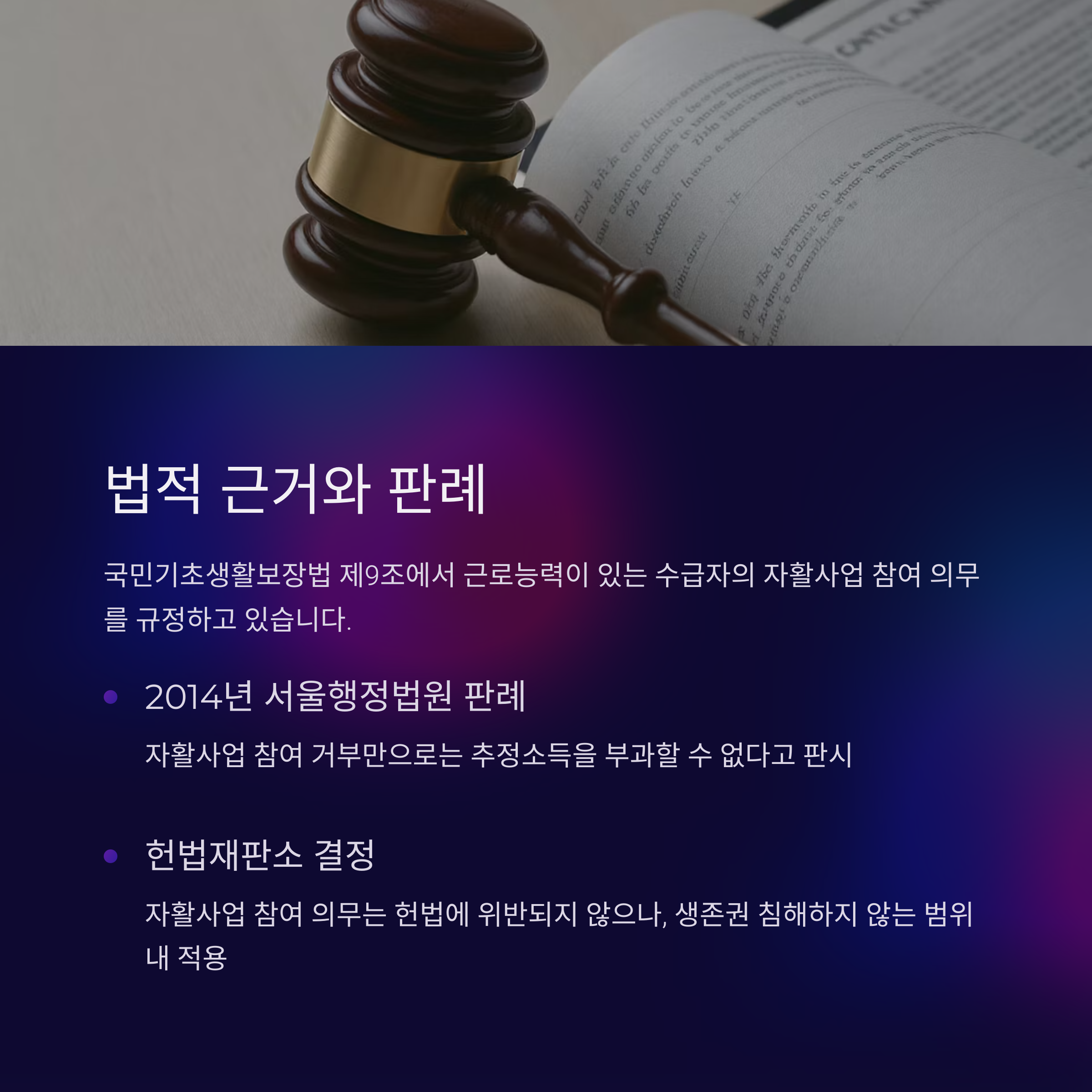 자활사업 참여 의무와 관련해서 중요한 법원 판례가 있어요. 2014년 서울행정법원은 추정소득 부과에 대해 위법하다고 판시했어요. 법원은 "개별가구의 소득평가액에서의 소득은 그 개별가구의 구성원이 실제로 벌어들이는 소득을 의미할 뿐"이라고 명확히 했어요. 이는 가상의 소득을 인정하는 것은 법적 근거가 없다는 의미예요.