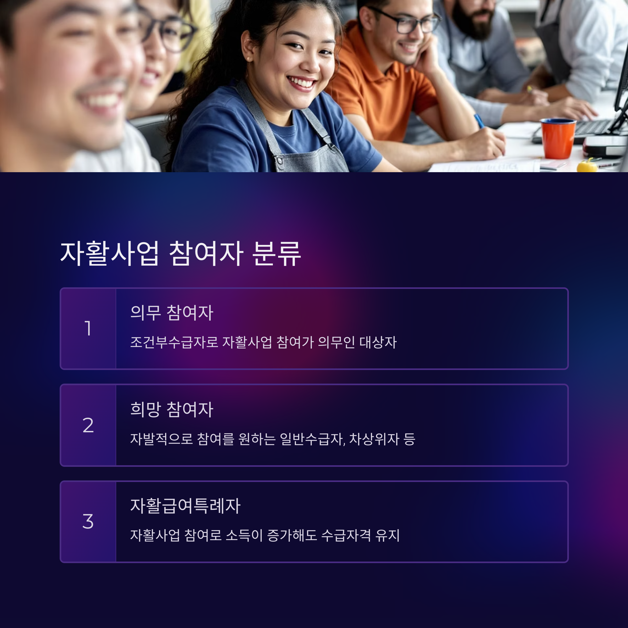 자활사업 참여 의무가 있는 대상자는 조건부수급자예요. 조건부수급자는 근로능력이 있음에도 불구하고 현재 충분한 소득을 얻지 못하고 있는 기초생활수급자를 말해요. 이들은 자활사업 참여를 조건으로 생계급여를 지급받게 되는데, 이는 단순한 복지 혜택이 아니라 자립을 위한 발판을 마련하는 과정이랍니다.