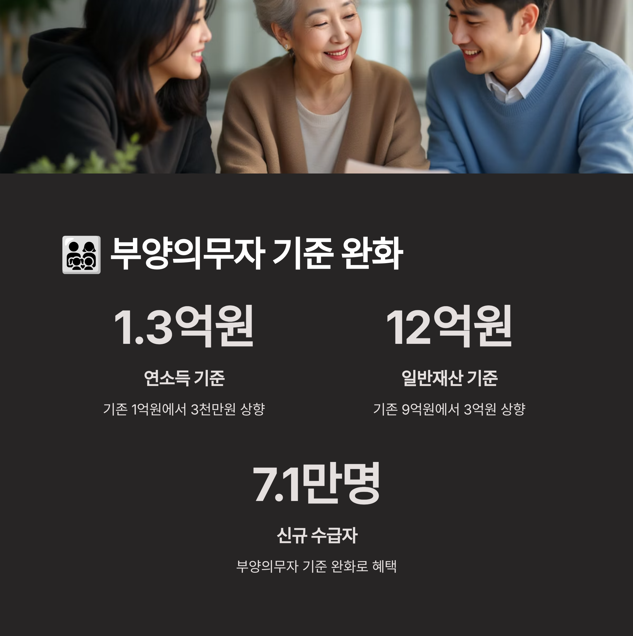 부양의무자 기준 완화로 중산층 자녀를 둔 노인분들도 수급 혜택을 받을 가능성이 높아졌어요. 가족 간 부양 부담도 줄어들 것으로 예상돼요! 👪
