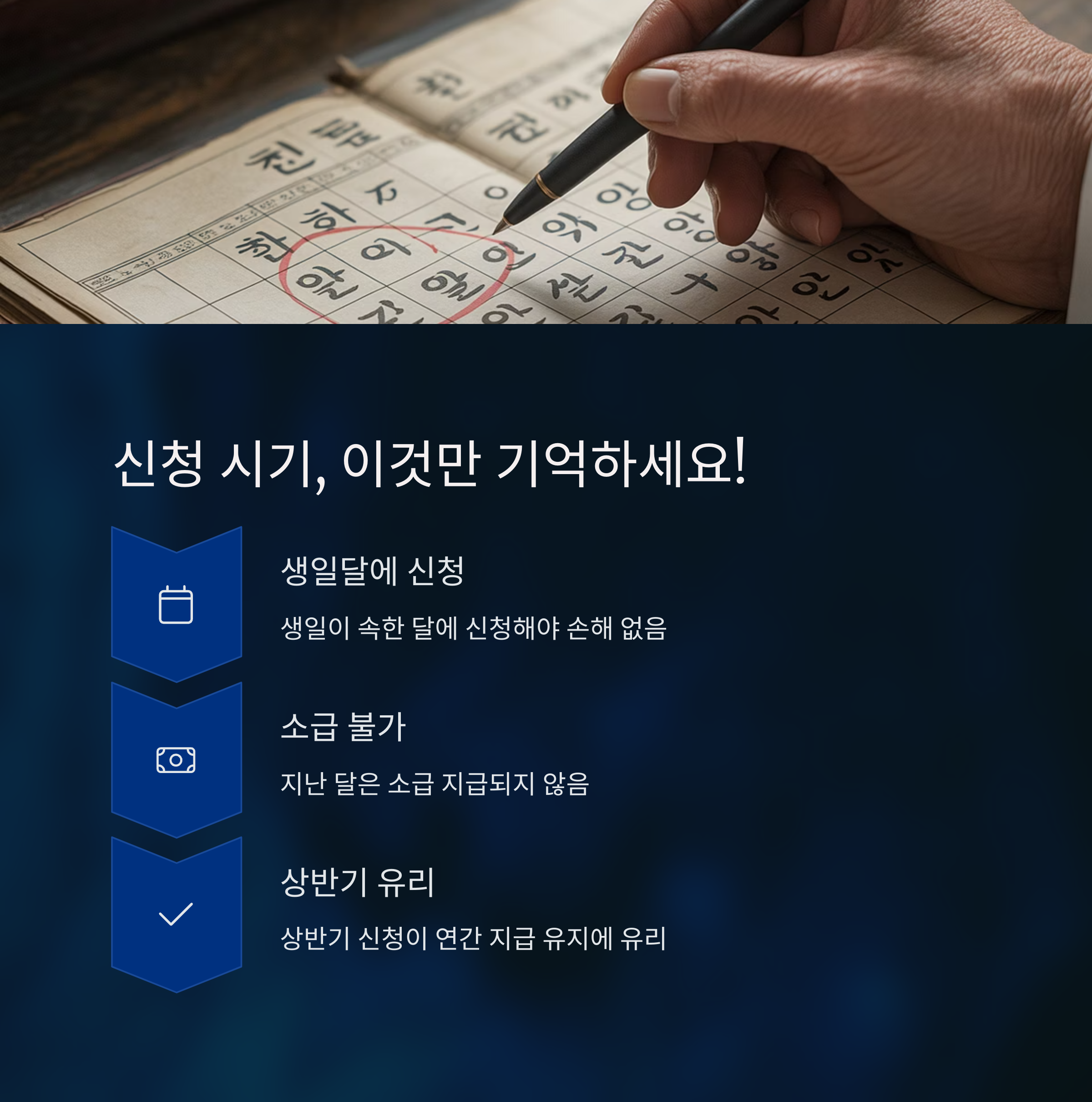 예를 들어 6월이 생일이라면 6월 1일부터 신청할 수 있고, 6월에 신청하면 6월분부터 연금을 받을 수 있어요. 하지만 7월에 신청하면 6월분은 지급되지 않아요. 무조건 생일달에 신청하는 게 핵심이에요.