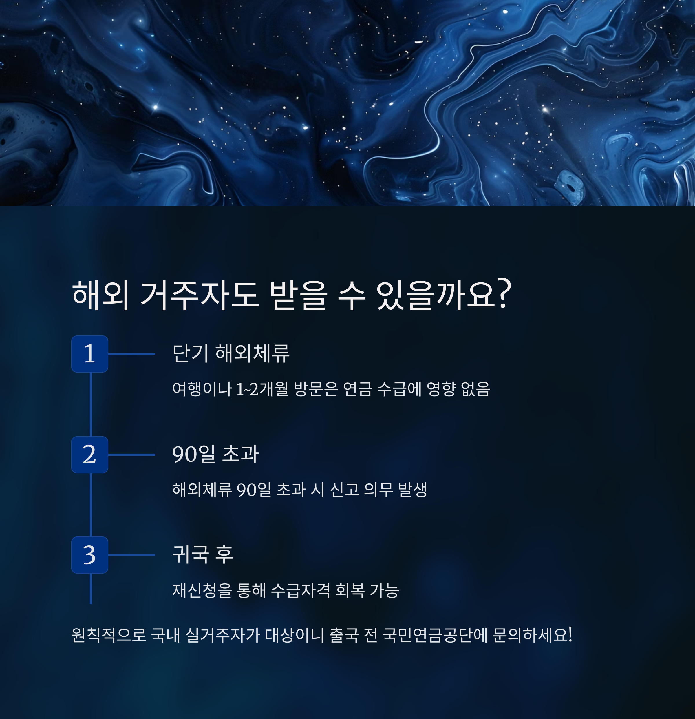 해외 거주 중에도 연금 수급이 가능한 국가 간 협약이 있는 경우엔 일부 인정되기도 해요. 다만 대부분은 ‘국내 실거주’ 조건이 핵심이니, 출국 전 공단에 문의하는 게 가장 확실해요!