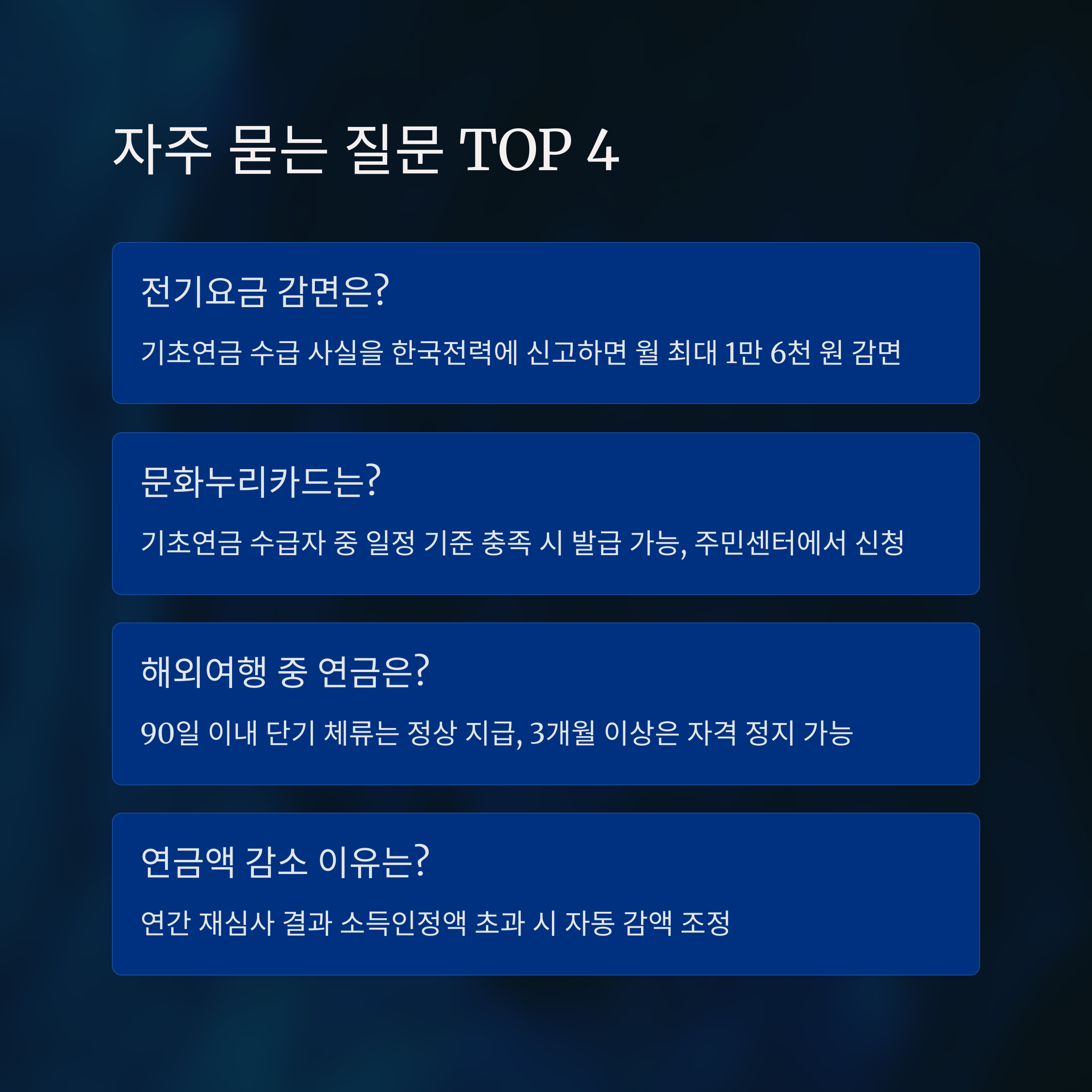 또한 건강보험료 경감, 기초생활보장 연계, 주거급여 지원, 노인일자리 우선 배정 등도 기초연금 수급자에게 유리하게 작용해요. 특히 전기료 감면은 월 최대 1만 6,000원까지 가능하답니다.