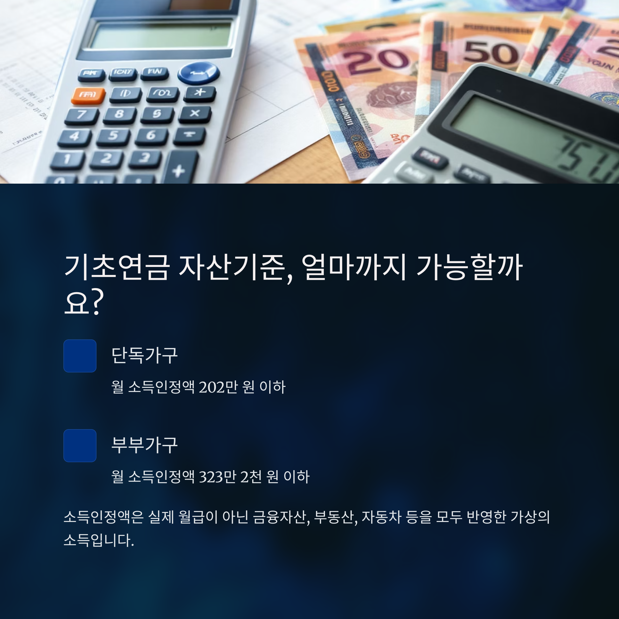 2025년 기준으로 단독가구는 월 202만 원, 부부가구는 323만 2천 원 이하의 소득인정액이어야 기초연금을 받을 수 있어요. 여기서 말하는 금액은 실제 월급이 아니라, 자산을 환산한 가상의 소득이에요.