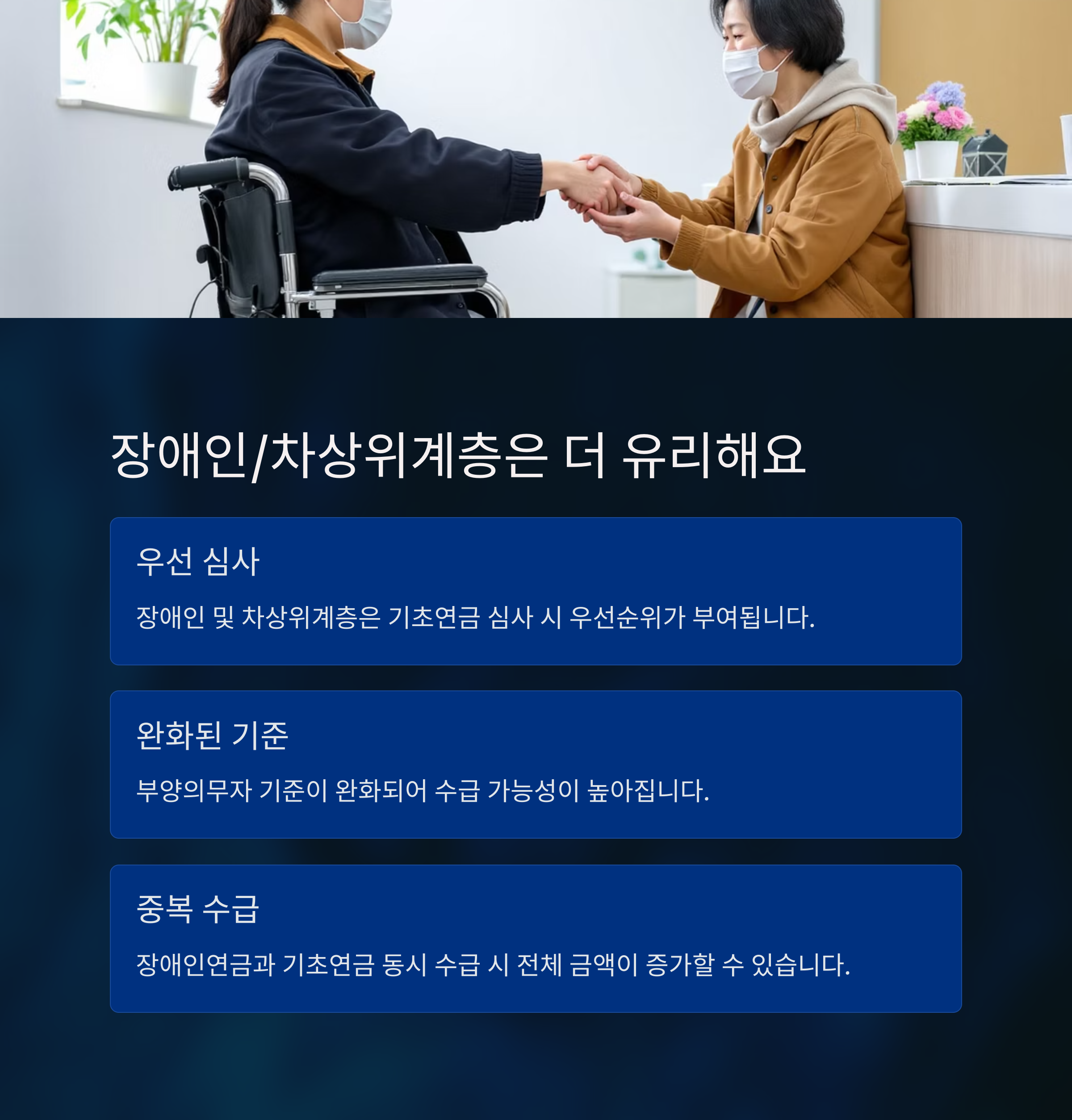 기초연금은 기본적으로 모든 65세 이상 국민이 대상이지만, 장애인 및 차상위계층은 심사 시 우선 순위가 주어져요. 이들에겐 보다 유연한 자산기준이 적용되거나, 심사 시 가점이 들어갈 수 있어요.
