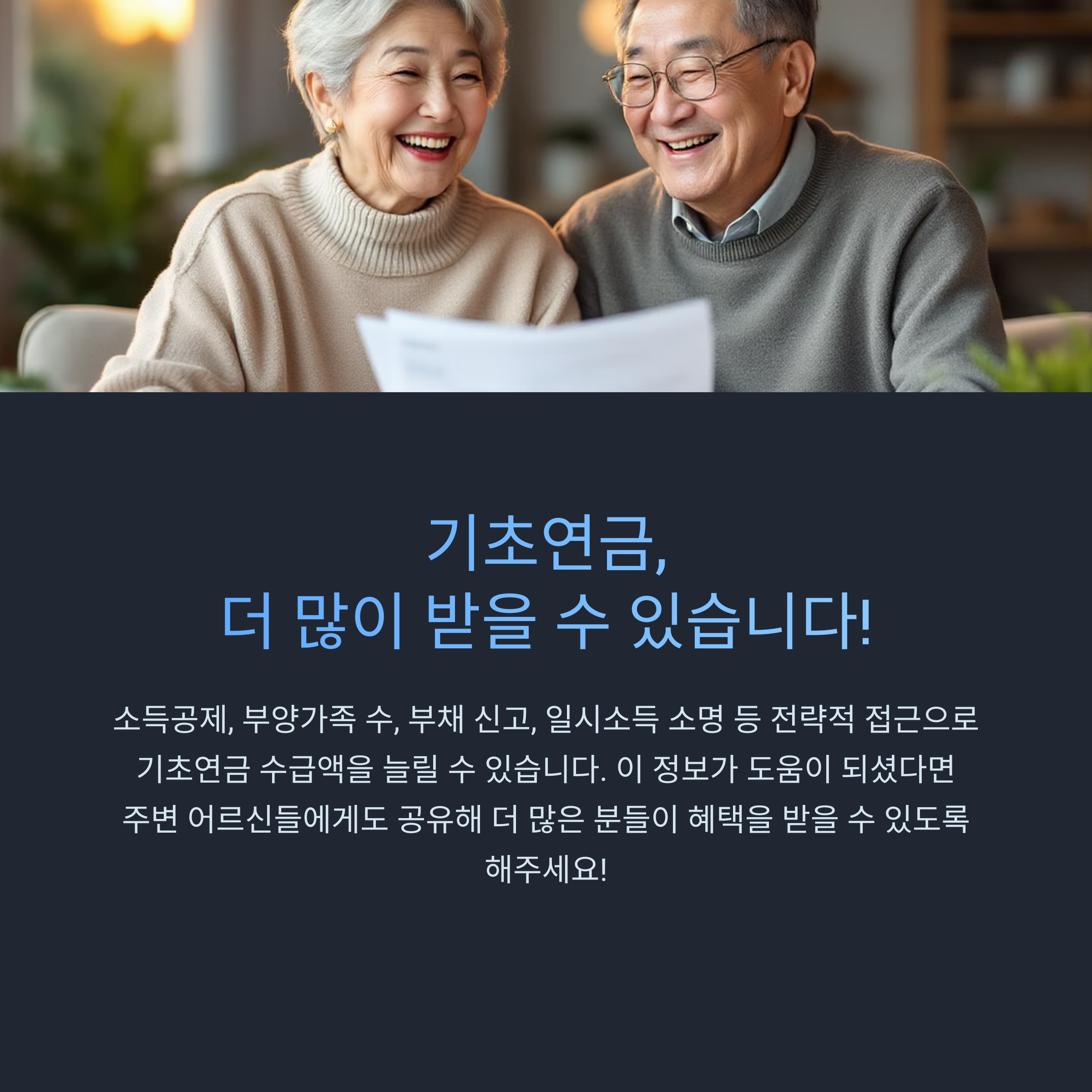 기초연금은 소득인정액에 따라 지급액이 달라지기 때문에, 공제를 최대한 활용하는 것이 수급액을 높이는 핵심이에요!