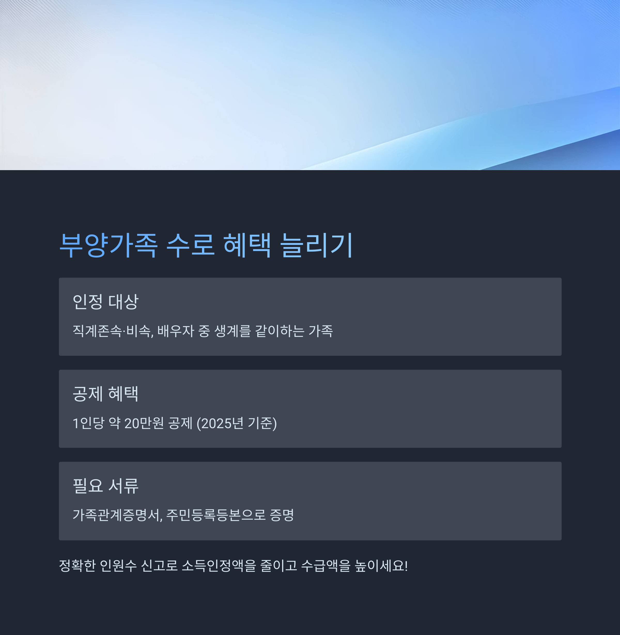 부양가족은 기본적으로 직계존속·비속, 배우자를 포함해요. 단, 실제 생계를 같이 하고 있어야 하고, 주민등록상 동일세대여야 해요.
