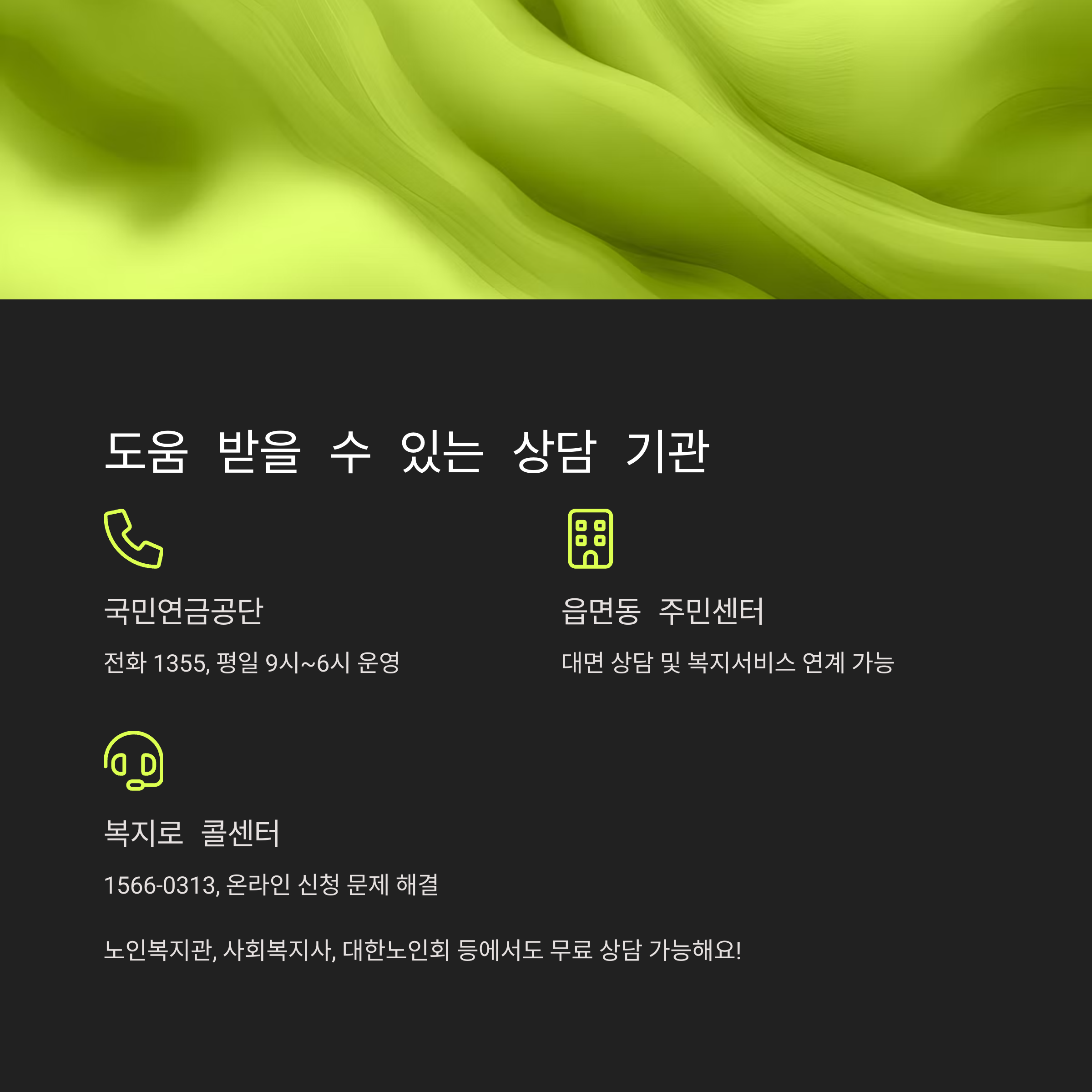 이외에도 노인복지관, 사회복지사, 대한노인회 등에서도 무료 상담을 받을 수 있으니, 주변 복지기관도 적극 활용해보세요!