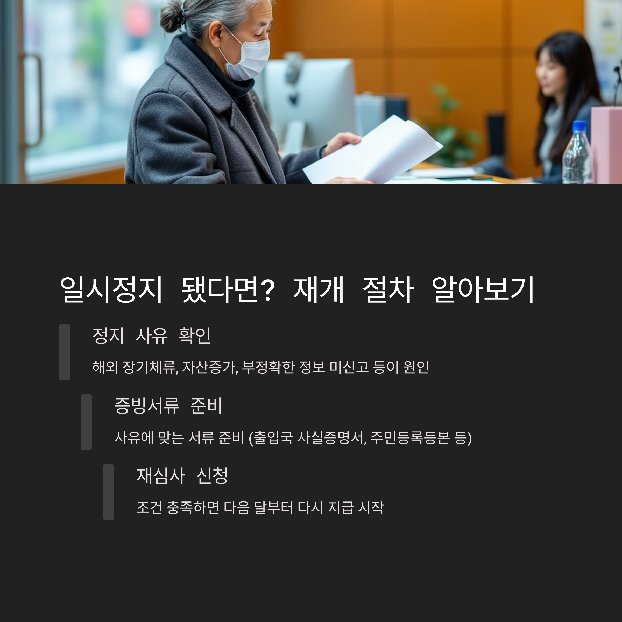 기초연금 수급이 일시정지되는 경우도 있어요. 대부분은 해외 장기체류, 자산증가, 부정확한 정보 미신고 등이 원인이에요. 정지가 됐다면 당황하지 말고, 재개 절차를 밟으면 돼요.
