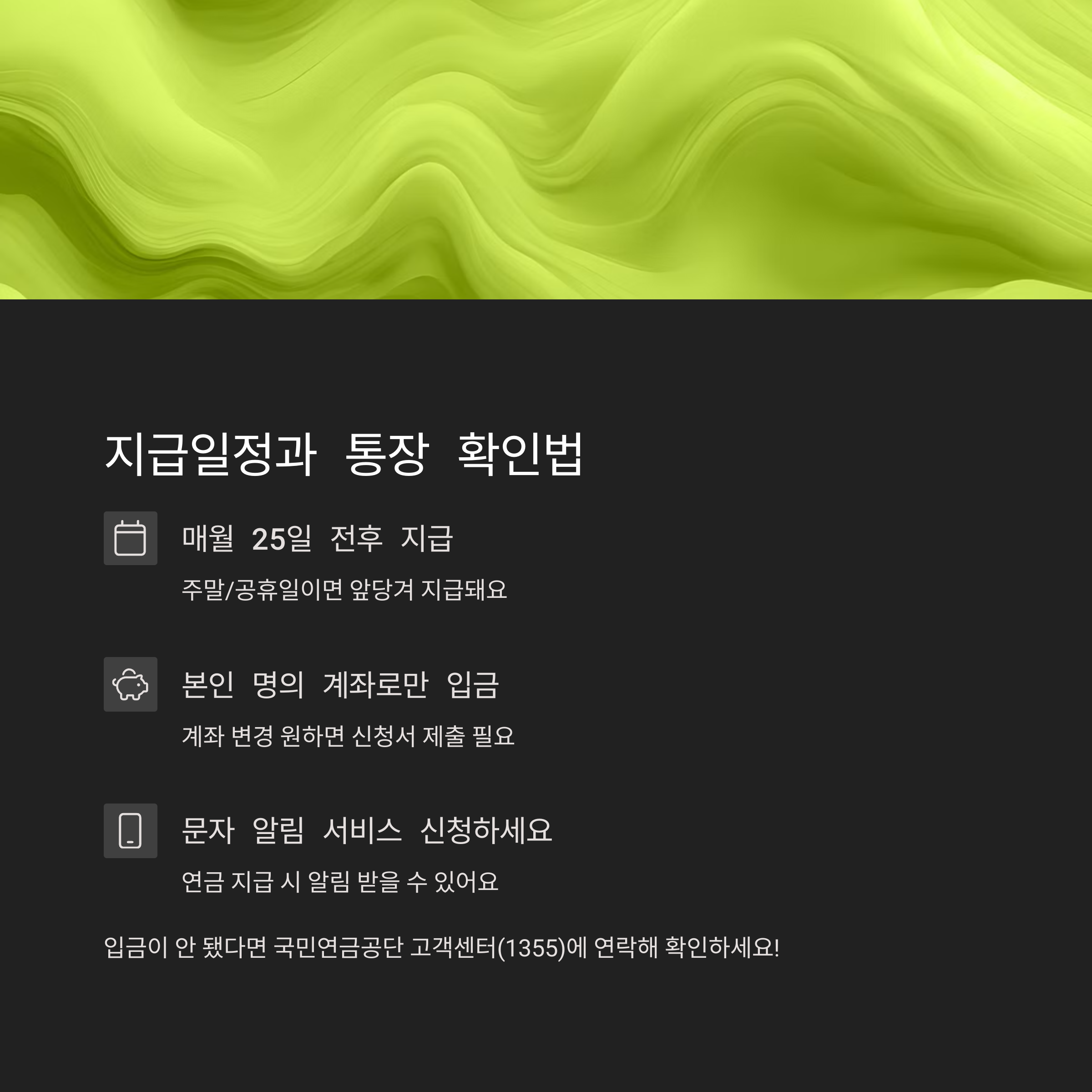 혹시 연금 지급일인데도 통장에 입금이 안 됐다면? 먼저 국민연금공단 고객센터(1355)에 연락해 지급 여부 확인부터 해보세요. 간혹 은행계좌 오류나 지급정지 사유가 있을 수도 있어요.