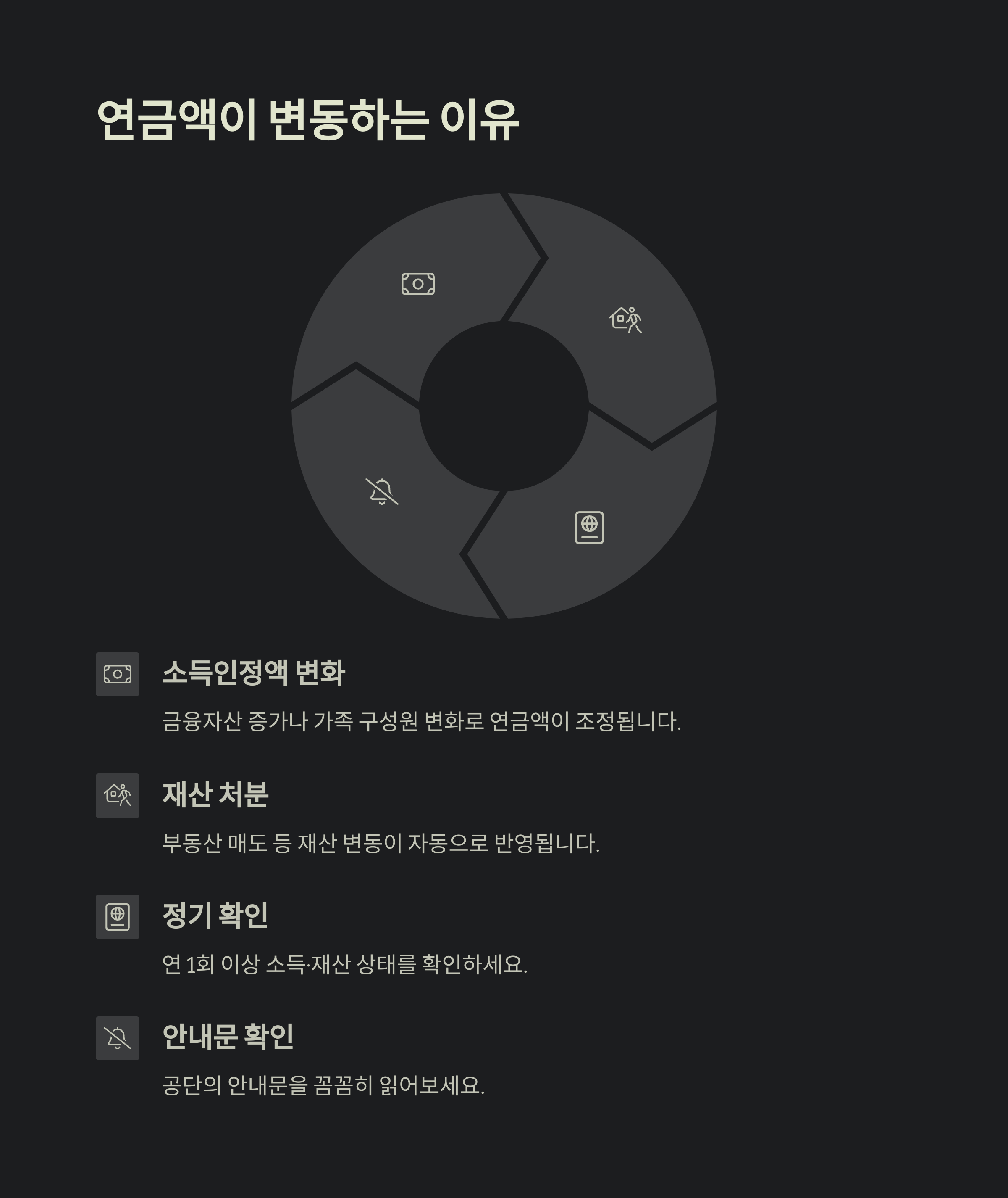 또한 재산 처분, 연금 외 소득 발생 등이 연금 지급에 영향을 줘요. 부동산 매도, 퇴직금 수령 등은 자동으로 정보가 공유돼 연금에 반영돼요.
