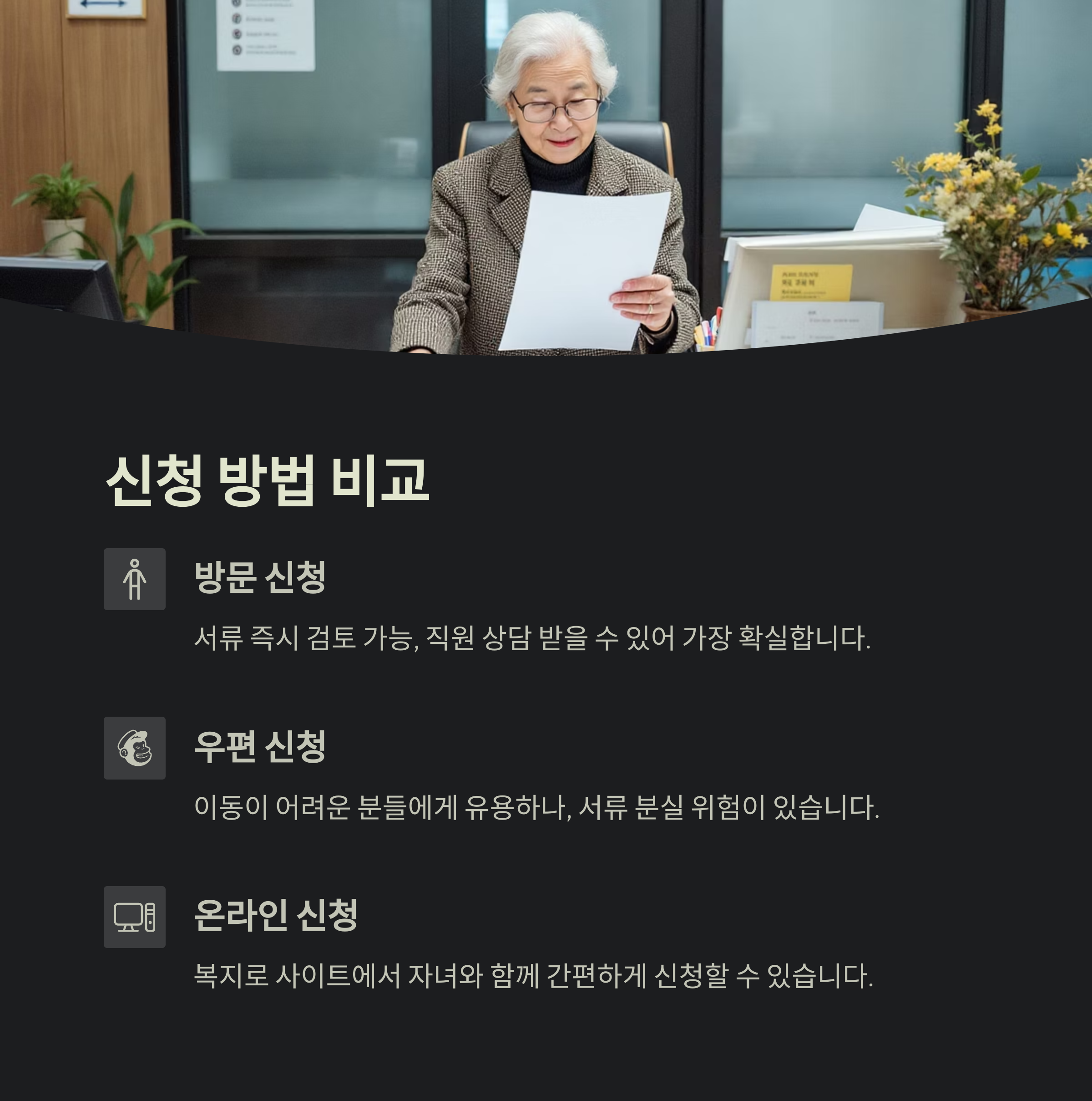 방문 신청은 서류 검토와 보완이 즉시 가능하다는 장점이 있지만, 몸이 불편한 어르신들에게는 부담이 돼요. 대신 주민센터 직원의 직접 상담을 받을 수 있다는 건 큰 장점이에요.