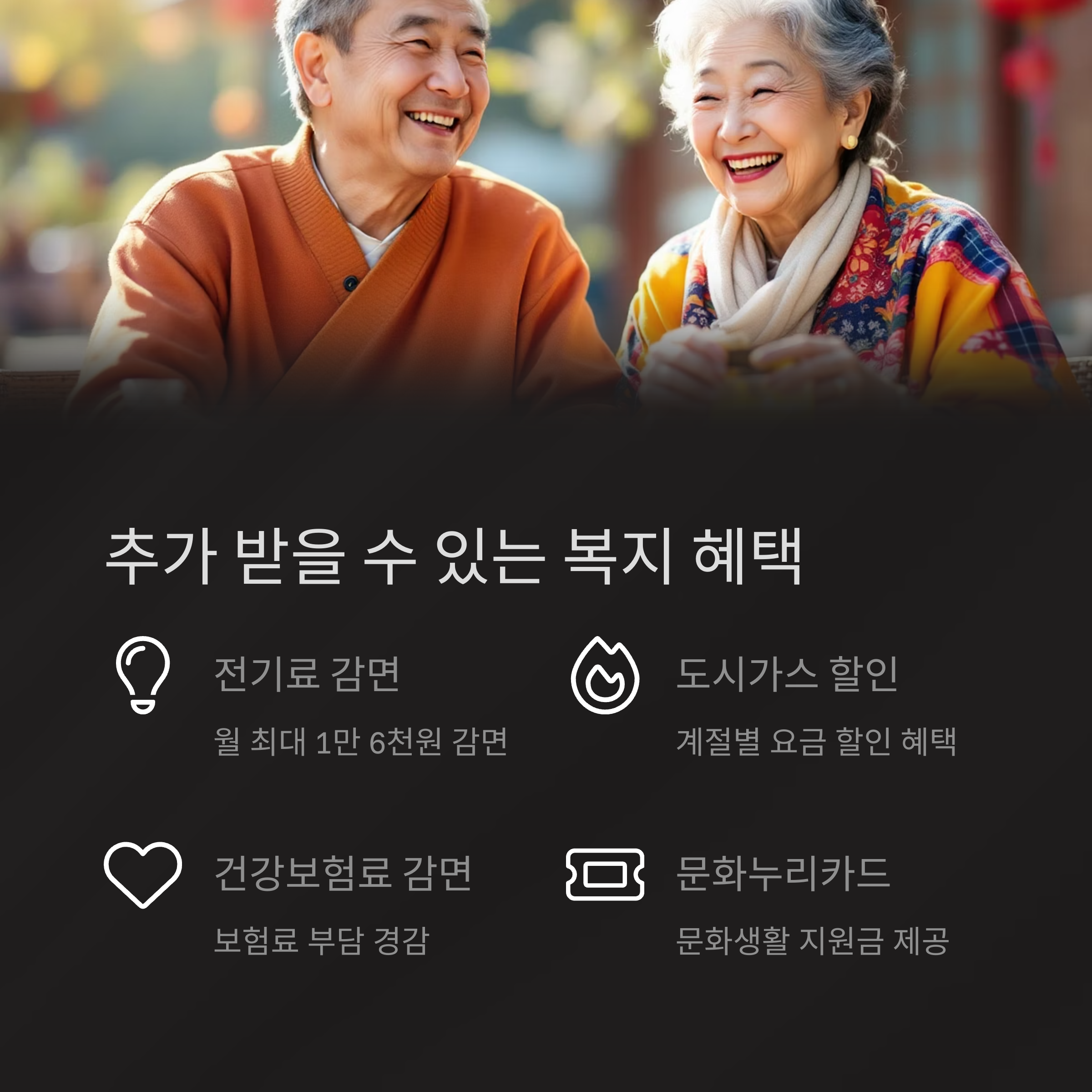 기초연금 수급자에게는 단순 연금 외에도 다양한 추가 복지 혜택이 따라와요. 대표적으로는 전기료 감면, 도시가스 요금 할인, 건강보험료 감면, 기초생활보장 연계 혜택 등이 있어요. 몰라서 신청 못 하는 경우가 정말 많아요.