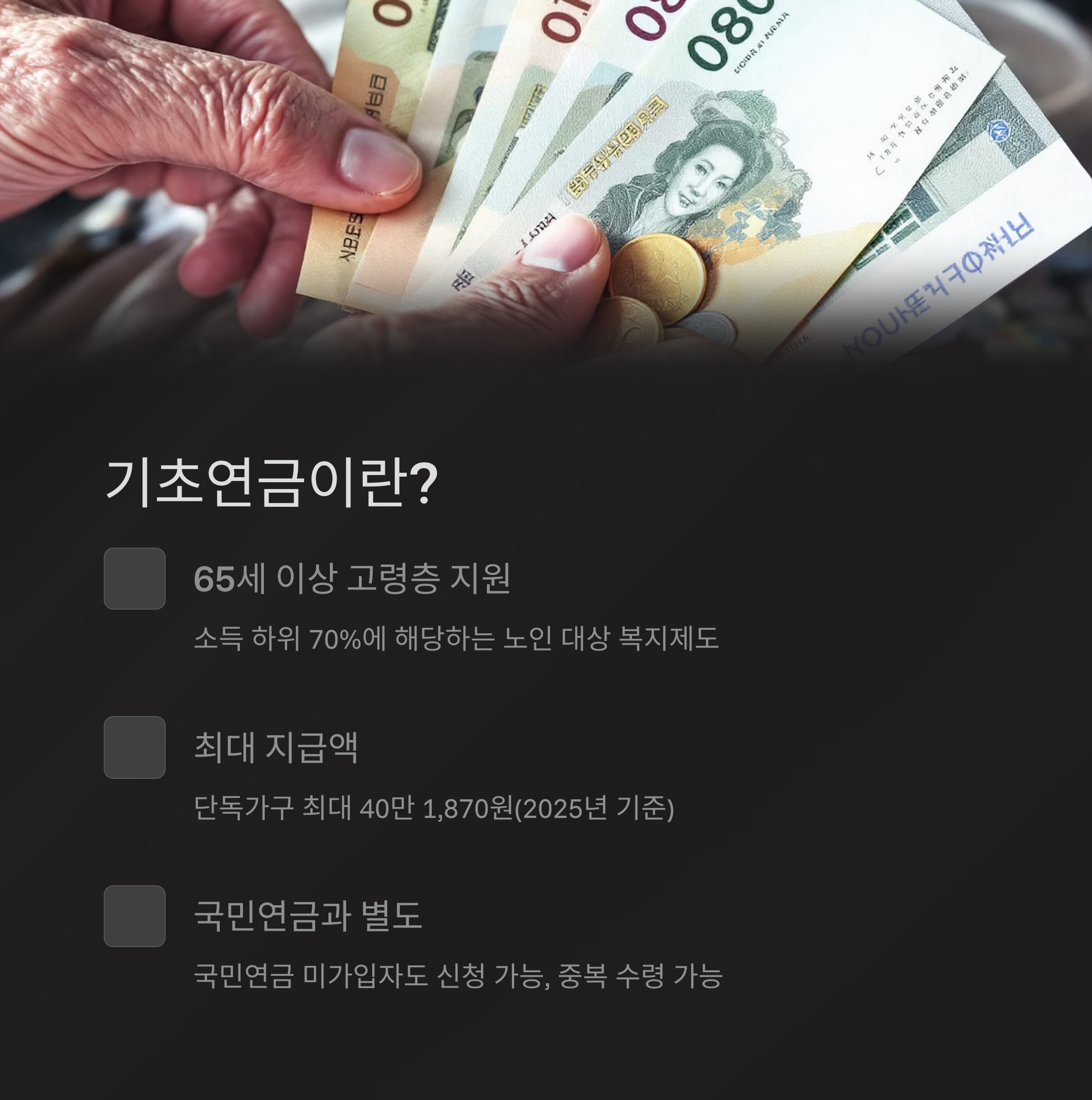 기초연금은 65세 이상 고령층의 노후 소득 보장을 위해 국가에서 매달 지급하는 복지 제도예요. 일정한 소득과 재산 기준을 충족하는 분들에게 지원되며, 단독가구는 최대 40만 1,870원(2025년 기준)까지 받을 수 있어요. 기초연금은 국민연금과는 별도로 지급되기 때문에, 중복 수령도 가능하답니다.