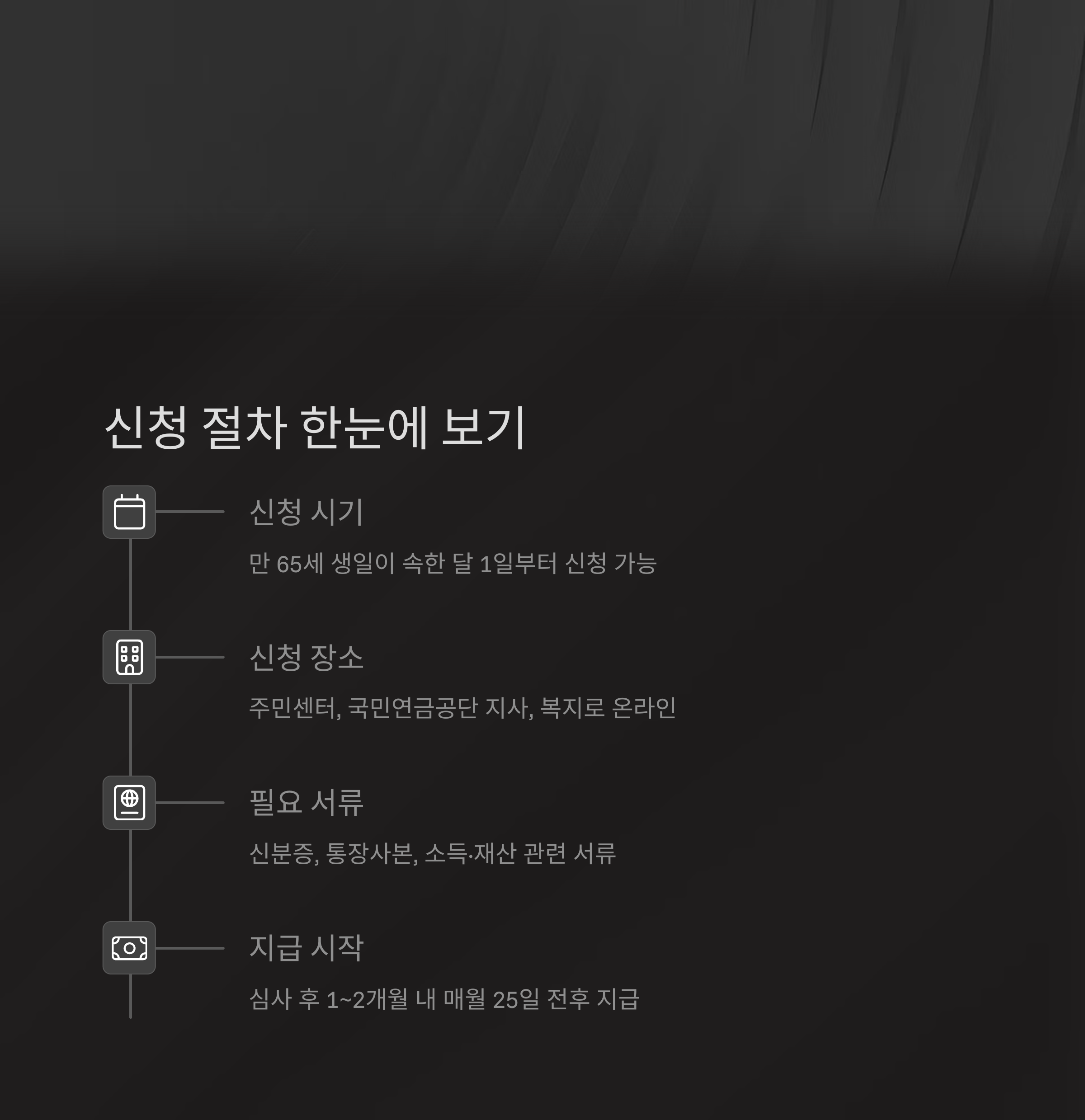 기초연금은 단순히 서류만 내면 끝나는 게 아니라 단계별로 확인해야 할 과정이 있어요. 먼저 신청 가능한 나이인 만 65세 이상이 되어야 하고, 생일이 속한 달 1일부터 신청할 수 있어요. 그러니 생일 이전에 미리 준비해두면 좋아요.