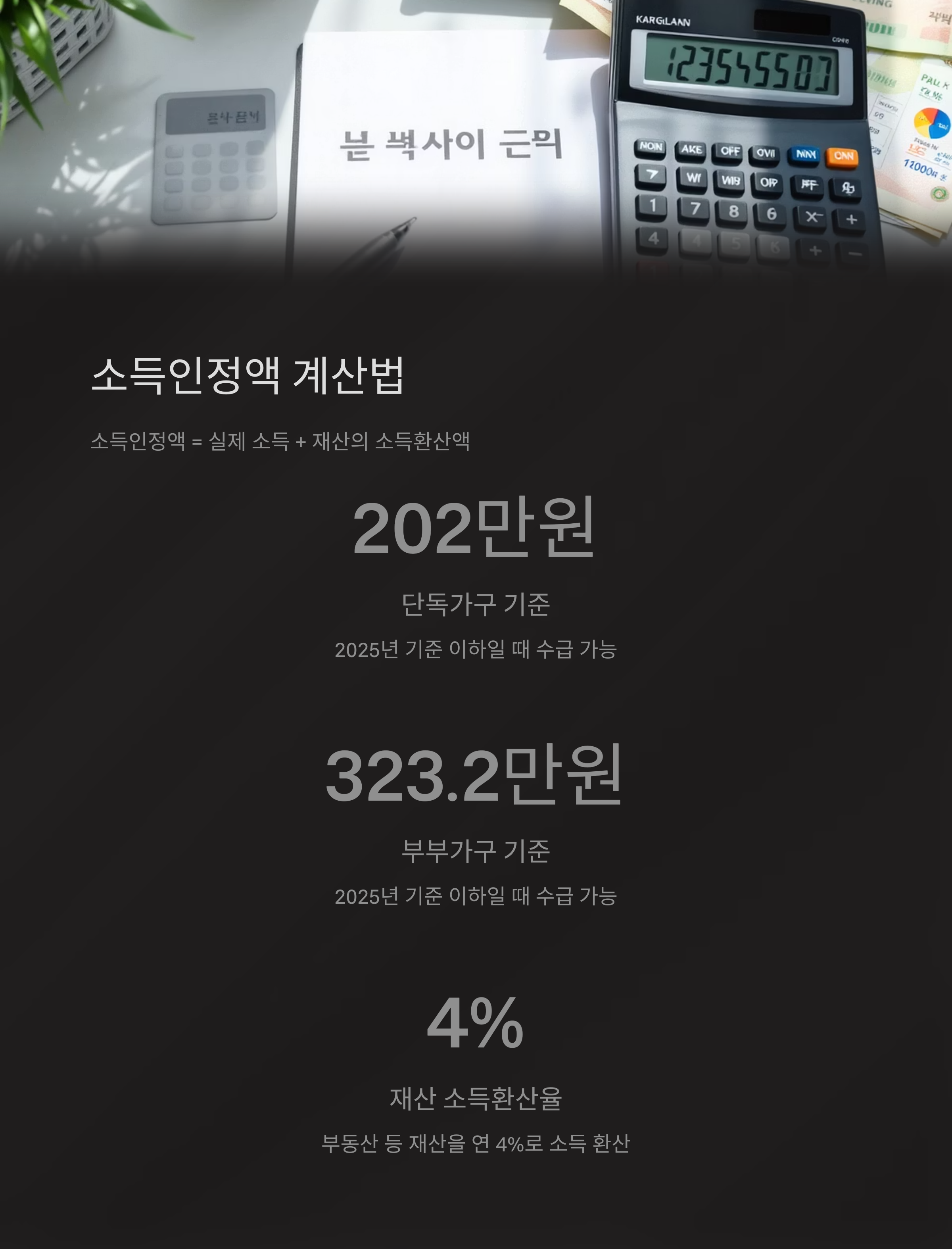 2025년 기준으로 단독가구는 202만 원 이하, 부부가구는 323만 2천 원 이하일 때 수급 대상이 될 수 있어요. 여기엔 금융소득, 부동산, 임대수입, 차량 등이 모두 포함돼요. 자동차가 있거나 예금이 많은 경우도 계산에 포함되니 주의하세요.