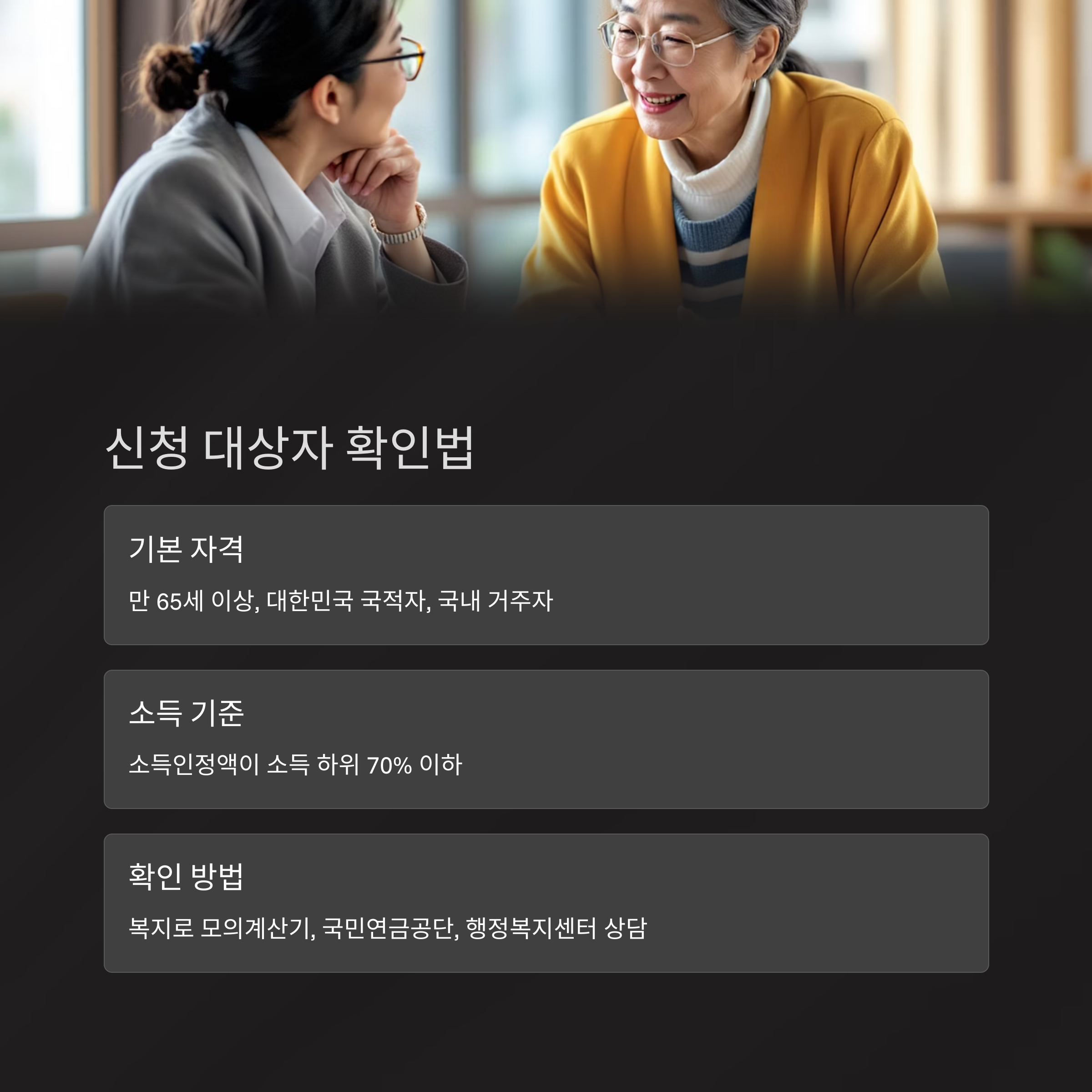 | 수급 대상 | 65세 이상, 소득 하위 70% |