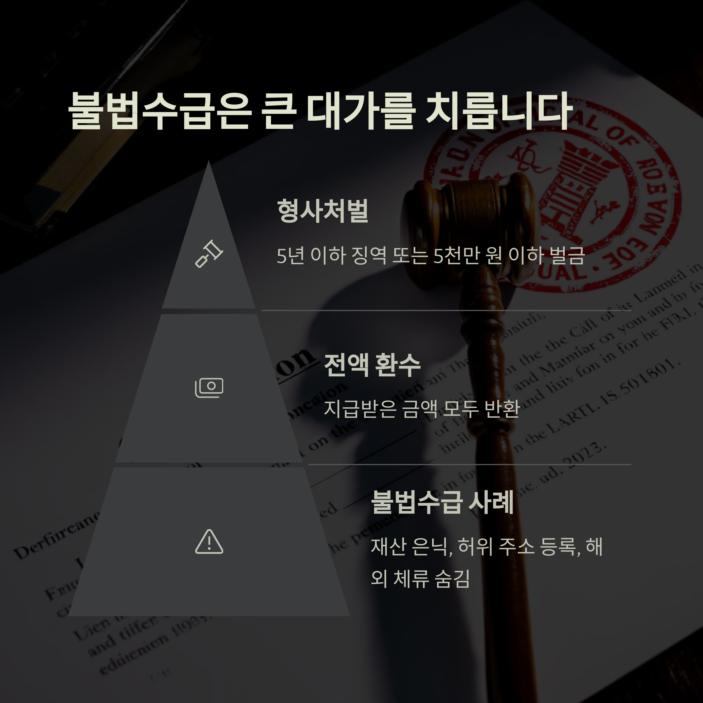 A7. 소득·재산을 숨기거나 허위 주소 등록 등으로 수급하면 불법이에요. 적발 시 형사처벌까지 가능해요.