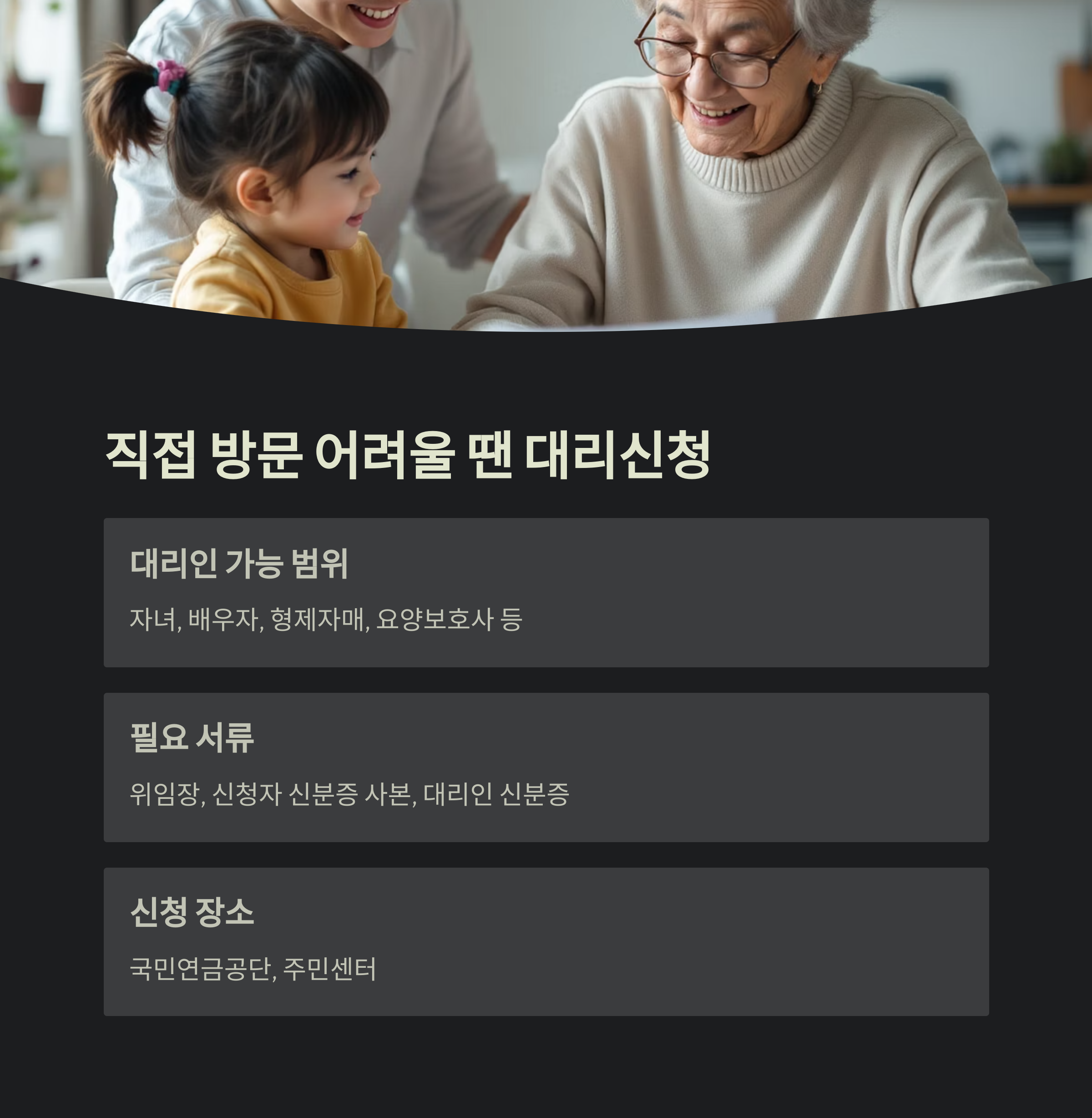 특히 본인이 병원에 입원했거나, 장기요양 중일 때는 요양기관의 진단서나 확인서류를 함께 제출하면 더 수월하게 진행돼요. 요양보호사나 사회복지사도 위임장을 지참하면 대리 가능해요.