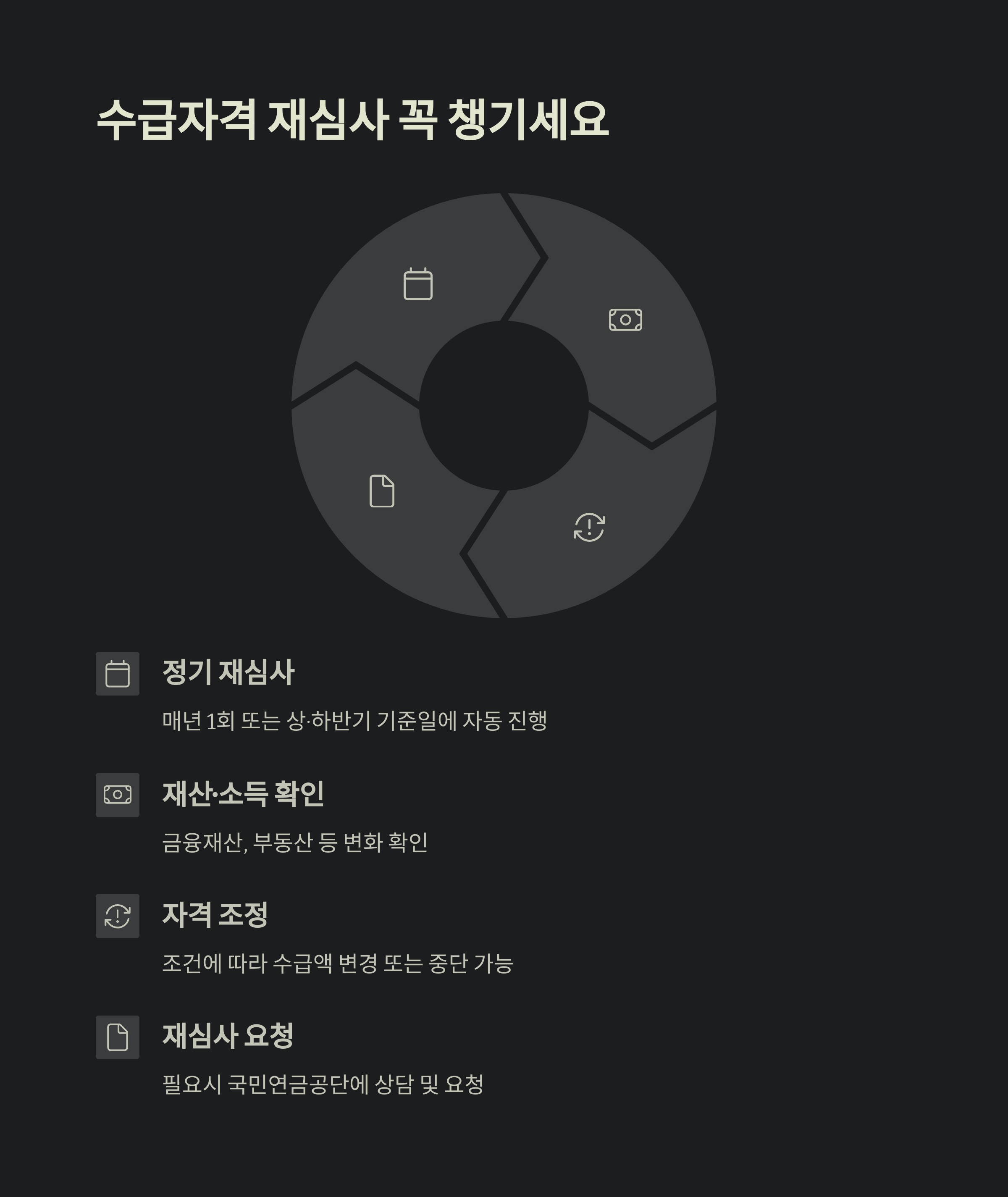 일반적으로 재심사는 매년 1회 또는 상·하반기 기준일에 따라 자동으로 진행돼요. 국민연금공단에서 수급자의 소득자료, 금융정보 등을 요청해 확인하는 방식이에요.