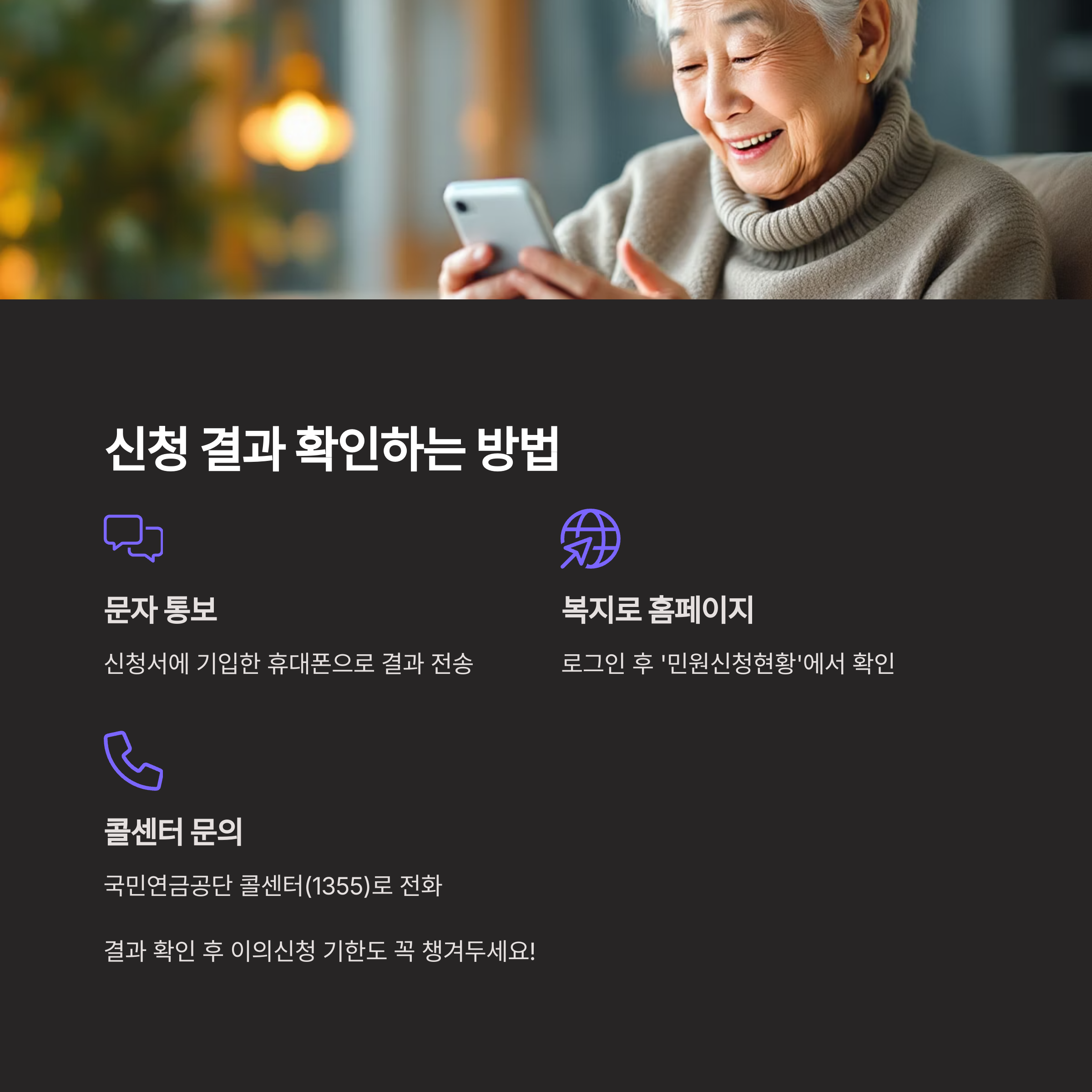 1. 문자 통보: 신청서에 기입한 휴대폰 번호로 결과가 전송돼요. 문자를 받지 못했다면 주민센터 또는 공단에 문의해보세요.