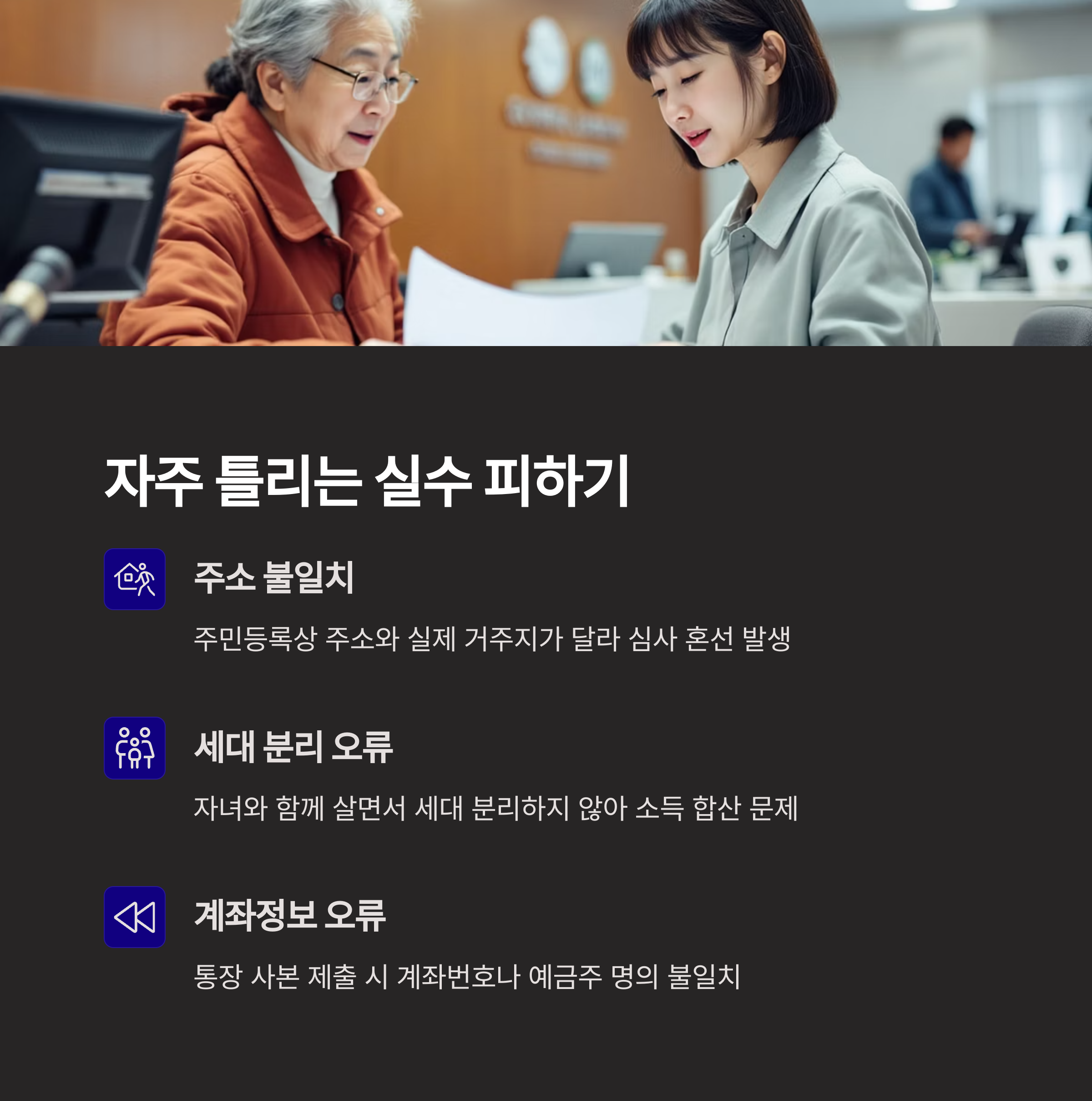 첫 번째 실수는 주소 불일치예요. 주민등록상 주소와 실제 거주지가 다르면 심사에 혼선이 생겨요. 이로 인해 서류 재제출이 발생하거나, 지급이 지연돼요.