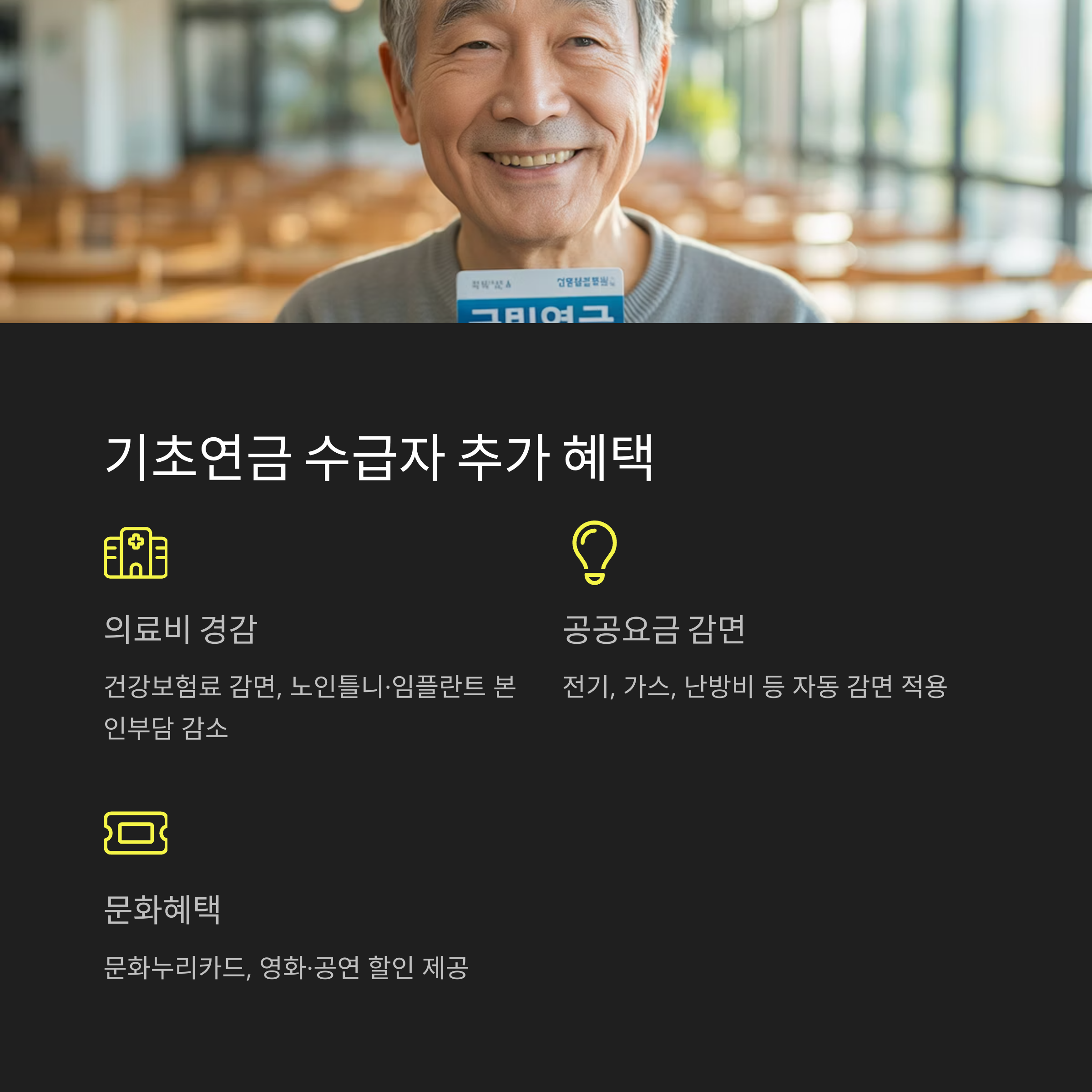 기초연금은 단순히 월 몇 만 원 받는 것에 그치지 않아요. 수급자에게는 다양한 추가 복지혜택이 따라붙어요! 🎉