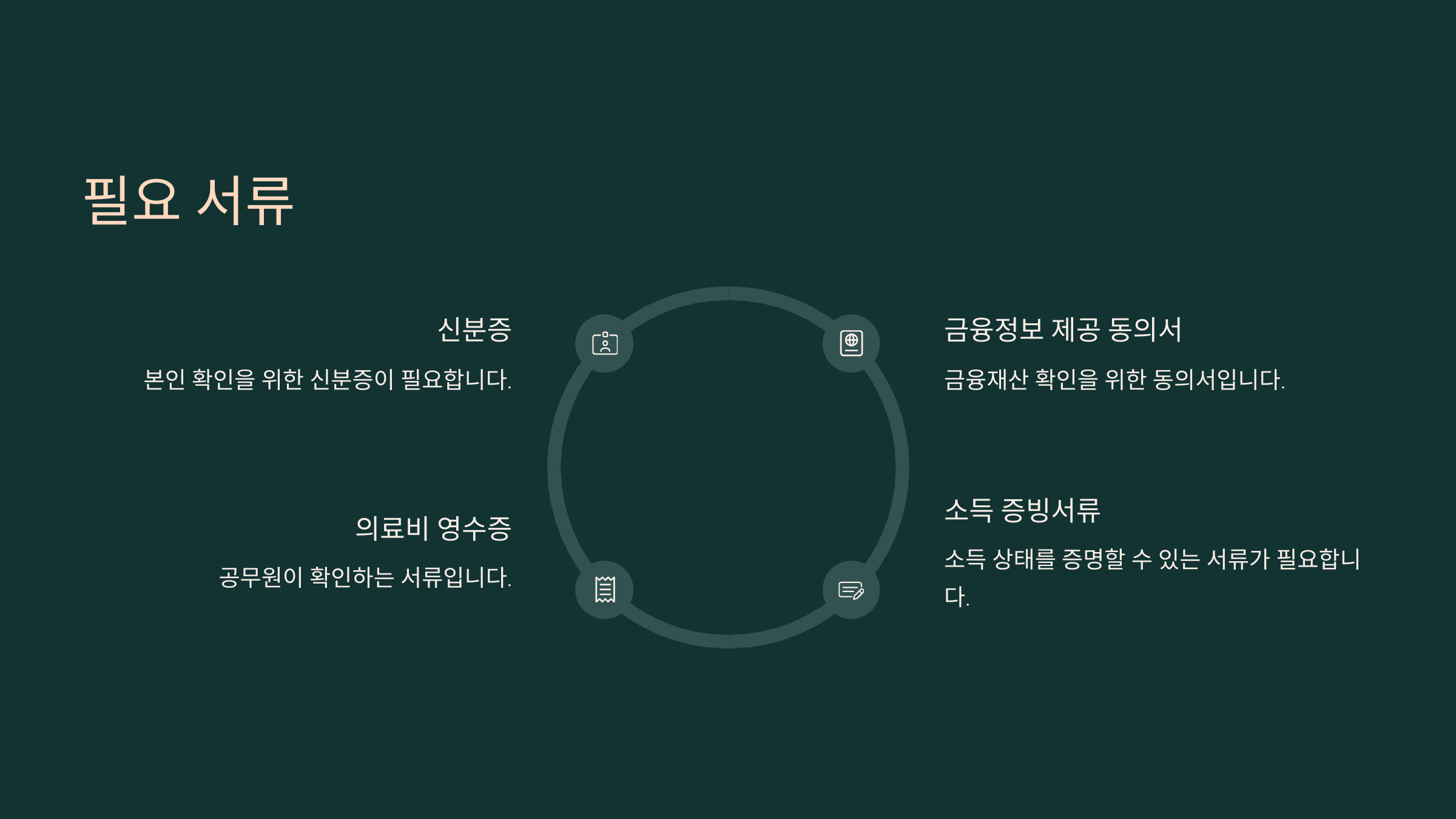 | 공무원 확인 | 주민등록등본, 가족관계증명서, 의료비 영수증 |