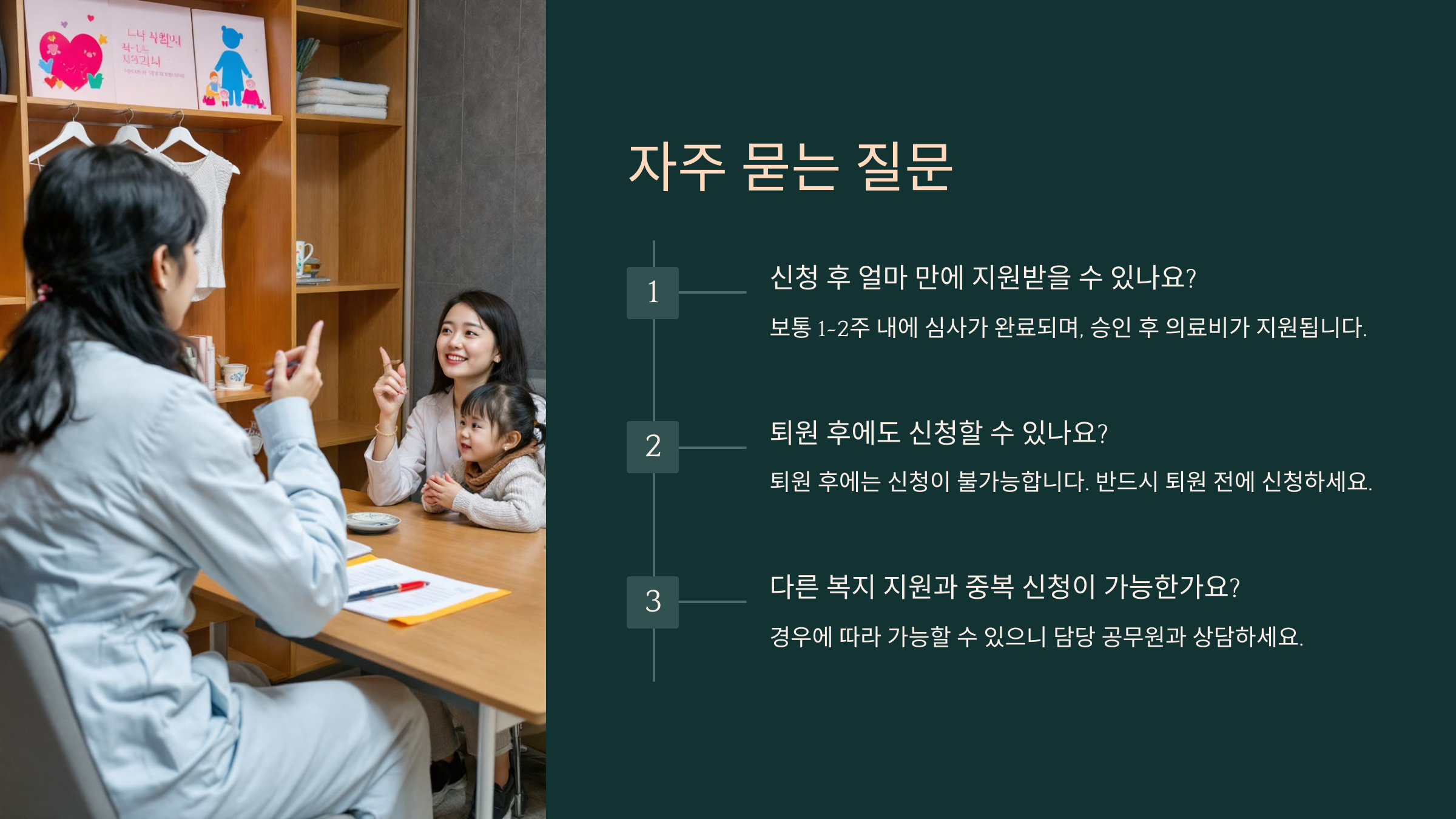 - 퇴원 후 신청하면 지원이 불가능하니 미리 서류를 준비해야 해요.