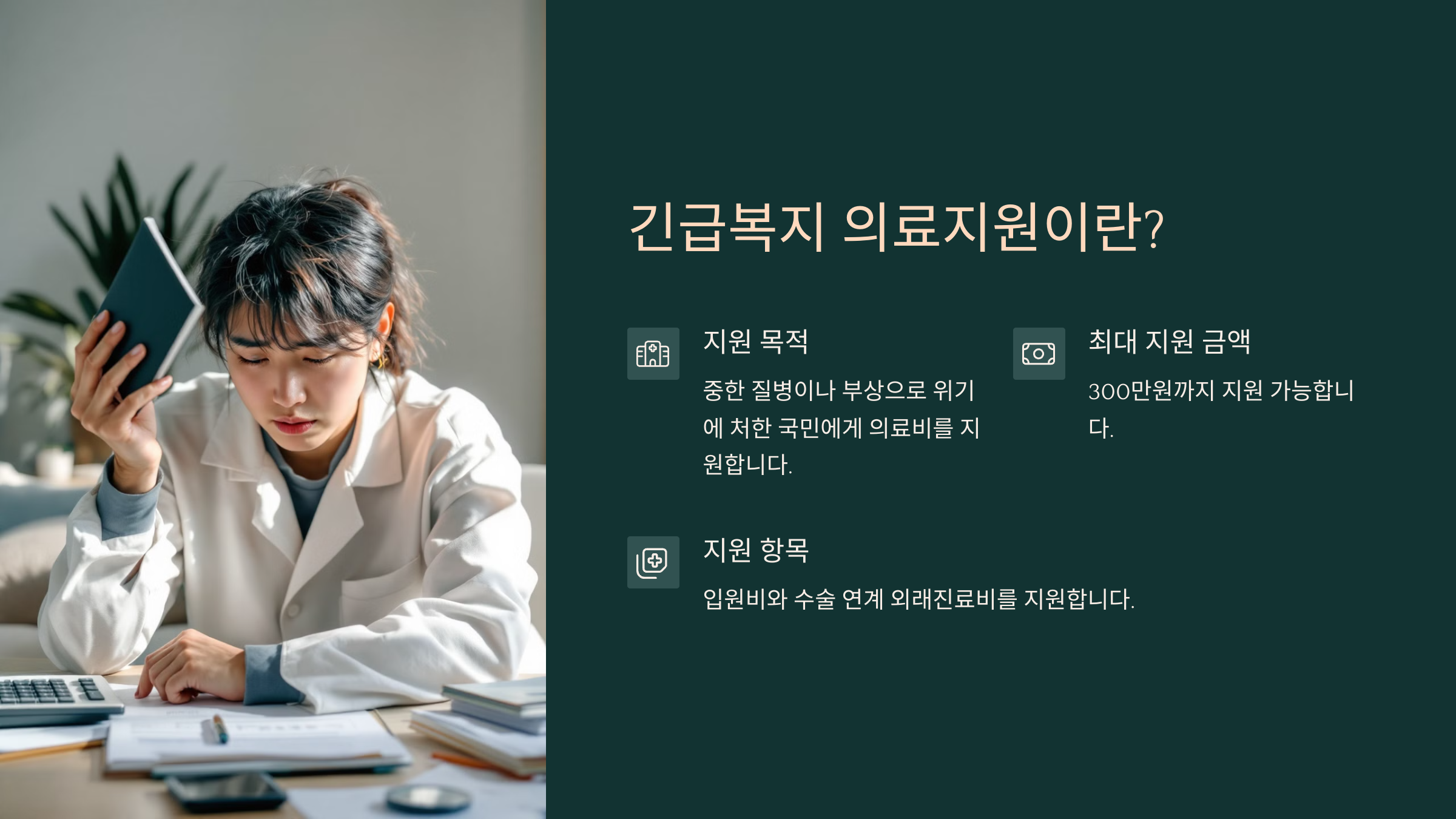 긴급복지 의료지원은 중한 질병이나 부상으로 인해 위기에 처한 국민에게 의료비를 지원하는 제도예요. 이 지원을 통해 경제적 어려움으로 인해 치료를 포기하는 상황을 방지하는 것이 목표랍니다.
