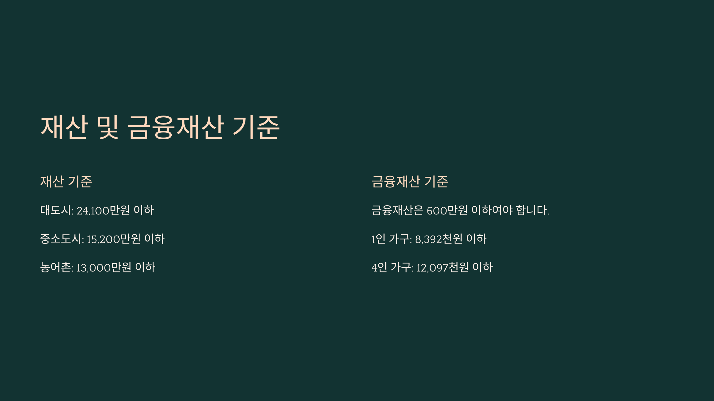 금융재산(현금, 예금, 주식 등)은 가구원별 생활 유지비를 포함하여 600만원 이하여야 해요. 단, 1인 가구의 경우 8,392천원 이하, 4인 가구의 경우 12,097천원 이하로 기준이 조금 다를 수 있어요.