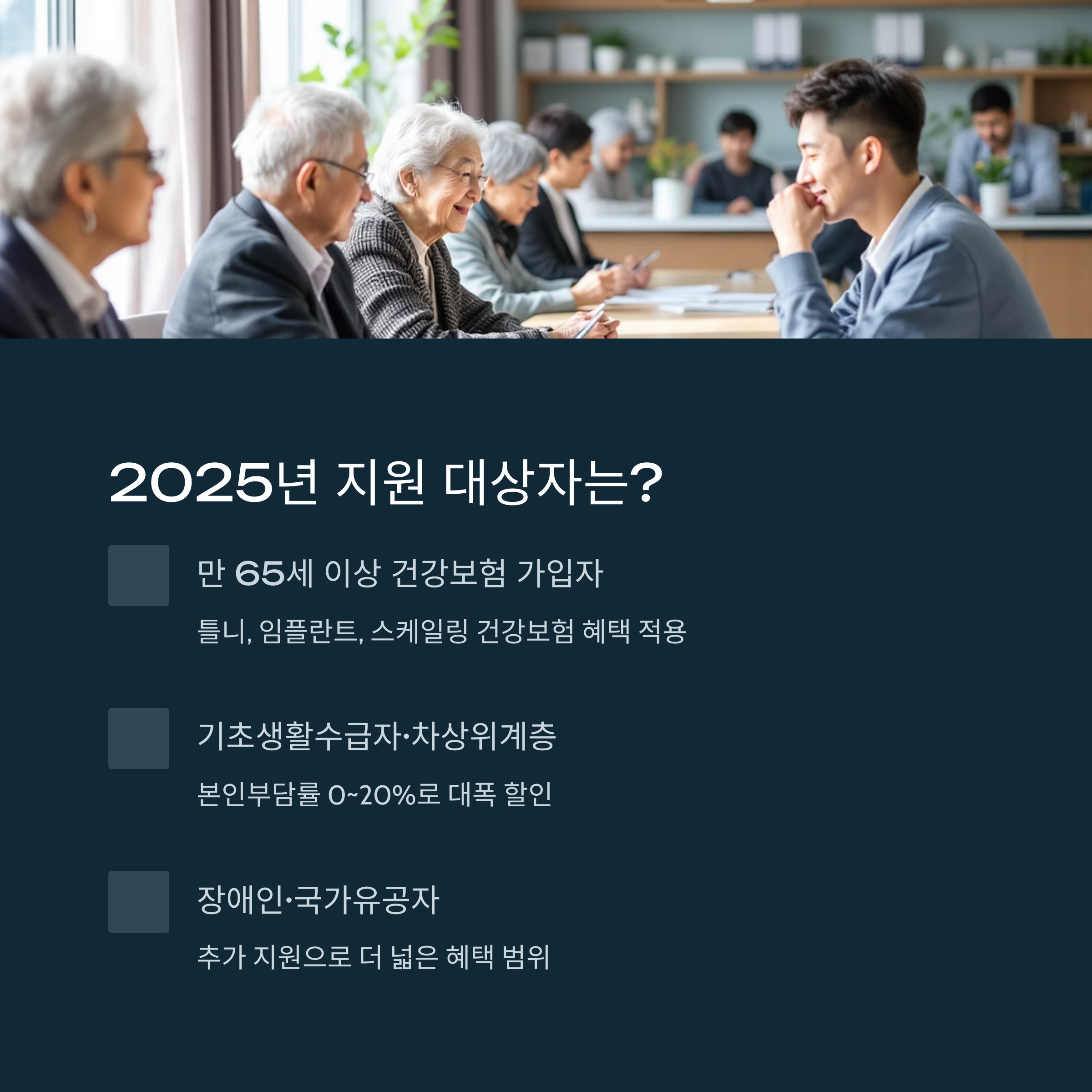 | 만 65세 이상 일반가입자 | 건강보험 가입 필수 | 틀니/임플란트/스케일링 지원 |