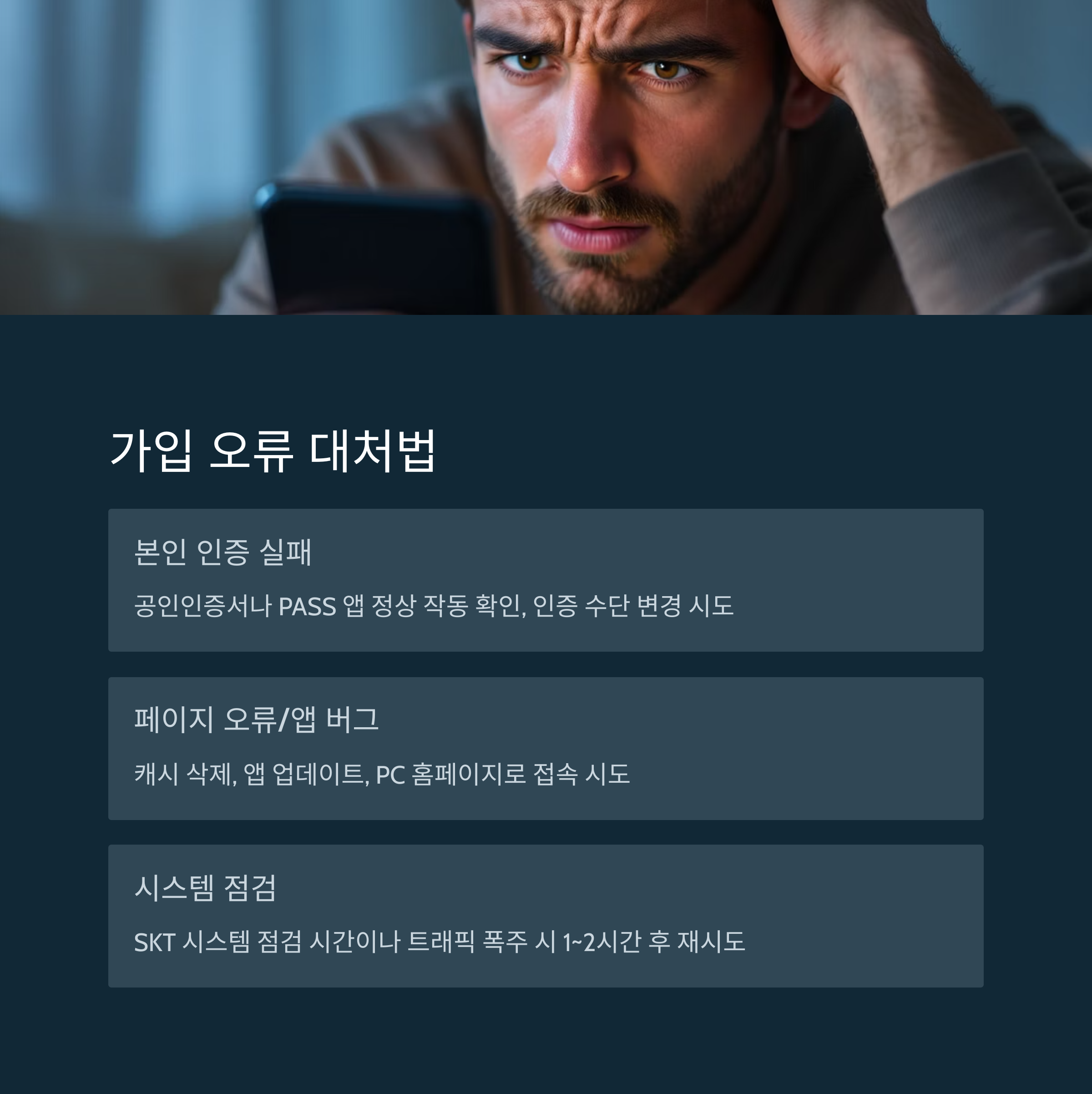 간혹 SKT 측 시스템 점검 시간(새벽 시간대)이나 트래픽 폭주 시 가입이 원활하지 않을 수 있어요. 이런 경우 1~2시간 후 다시 시도하면 정상적으로 처리되는 경우가 많아요.