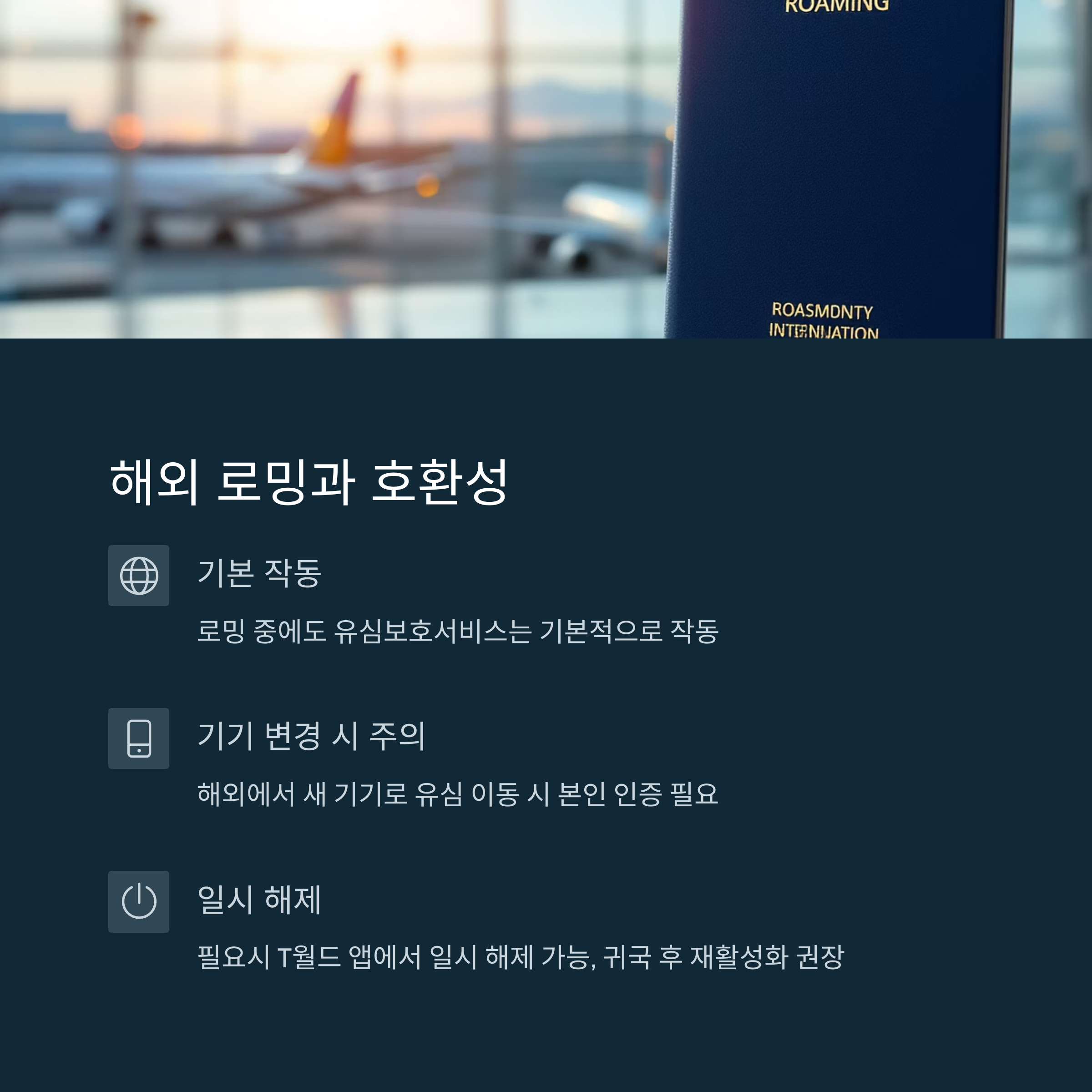 유심보호서비스는 로밍 중에도 기본적으로 작동해요. 즉, 해외에서 누군가 내 유심을 변경하거나 번호이동을 시도해도 서비스가 이를 차단해줘요. 단, 실제 로밍 통신 자체에는 영향을 주지 않기 때문에 걱정 없이 통화나 데이터를 사용할 수 있어요.