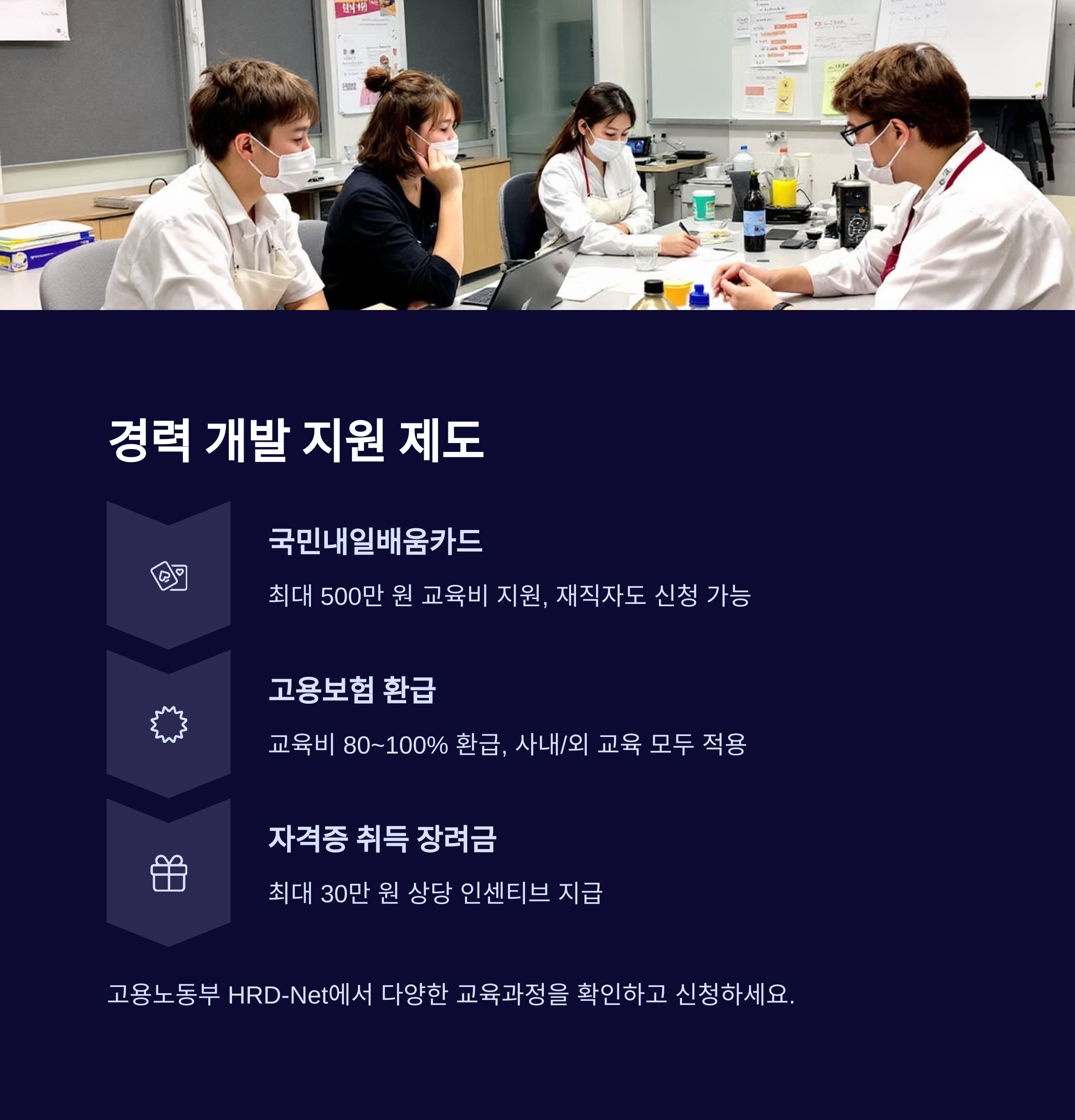 🎓 요즘은 직장인도 평생학습이 필수예요. 특히 자격증 취득, 이직 준비, 커리어 전환을 계획하고 있다면, 정부가 제공하는 직업훈련 복지제도를 적극 활용해보는 게 좋아요.