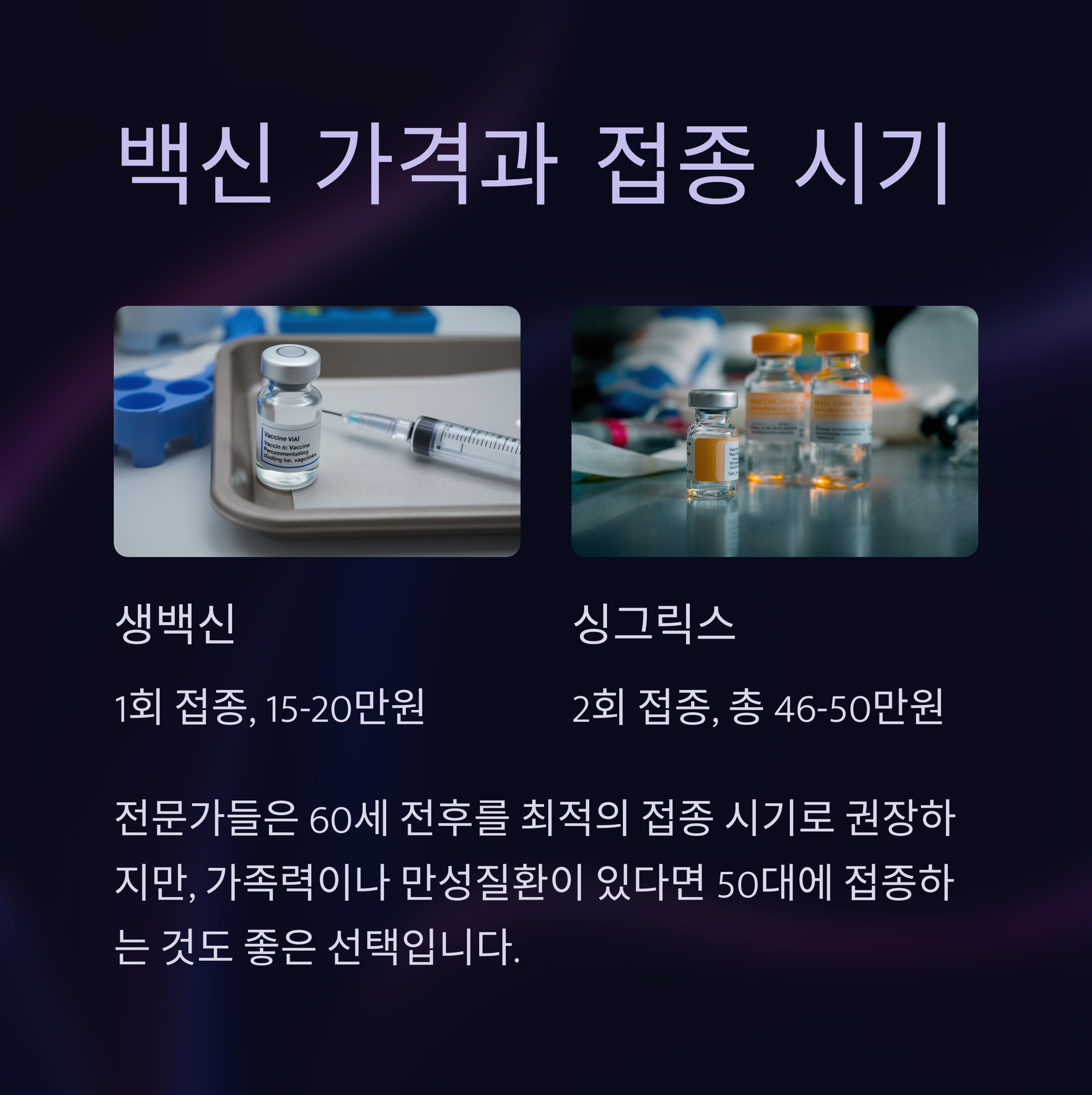 A2. 예방 효과와 안전성 면에서는 싱그릭스가 우수해요. 특히 면역저하자나 만성질환자는 싱그릭스를 선택해야 해요. 다만 비용이 2배 이상 비싸므로, 건강 상태와 경제적 여건을 고려해 선택하시면 돼요.