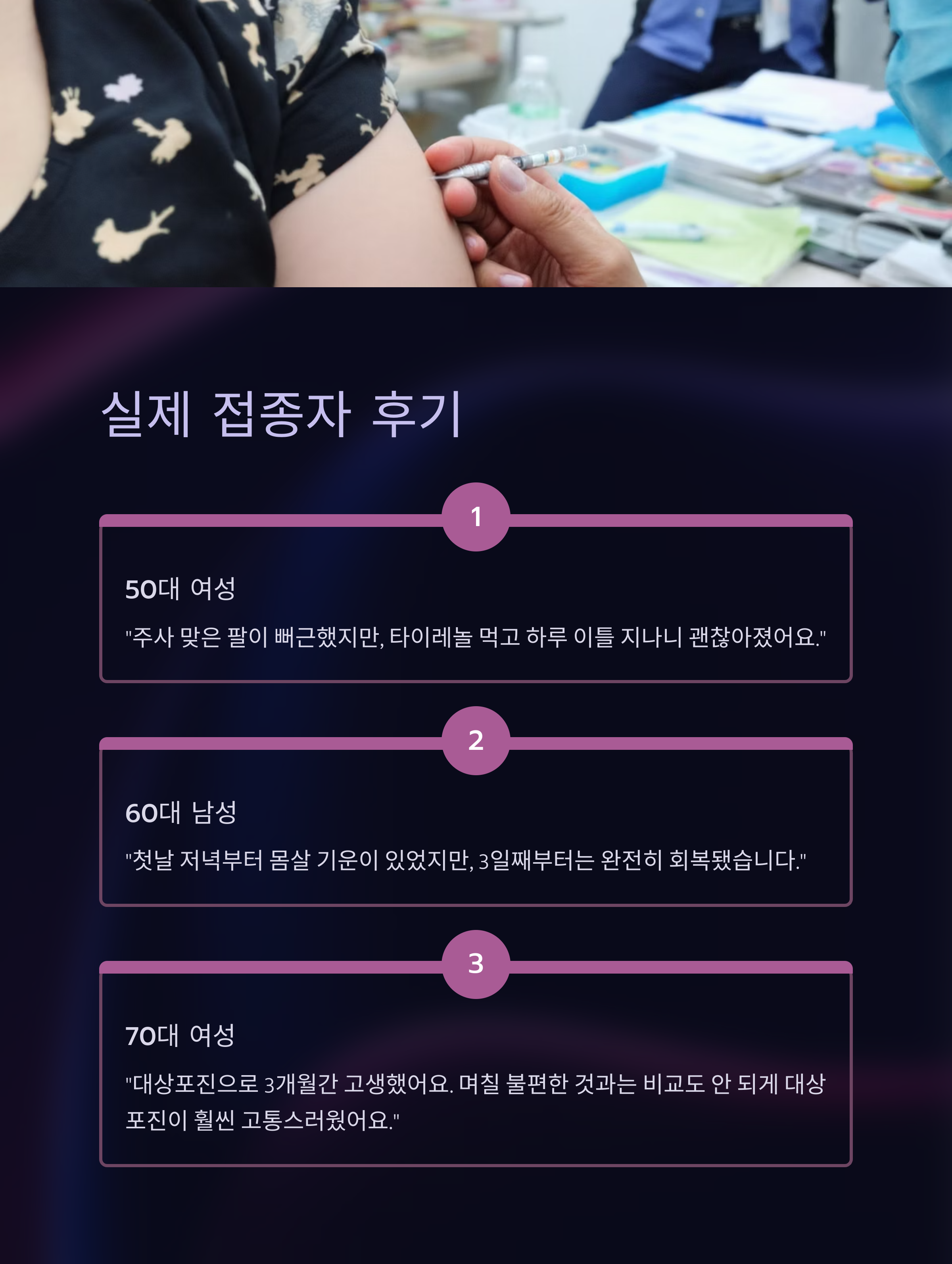 가장 많이 보고되는 경험은 접종 부위의 통증이에요. 한 50대 여성분은 "주사 맞은 팔이 뻐근하고 묵직한 느낌이 들었어요. 팔을 들어올리기 불편할 정도였지만, 타이레놀 먹고 하루 이틀 지나니 괜찮아졌어요"라고 전했어요. 이런 국소 반응은 백신이 제대로 작동하고 있다는 신호랍니다.