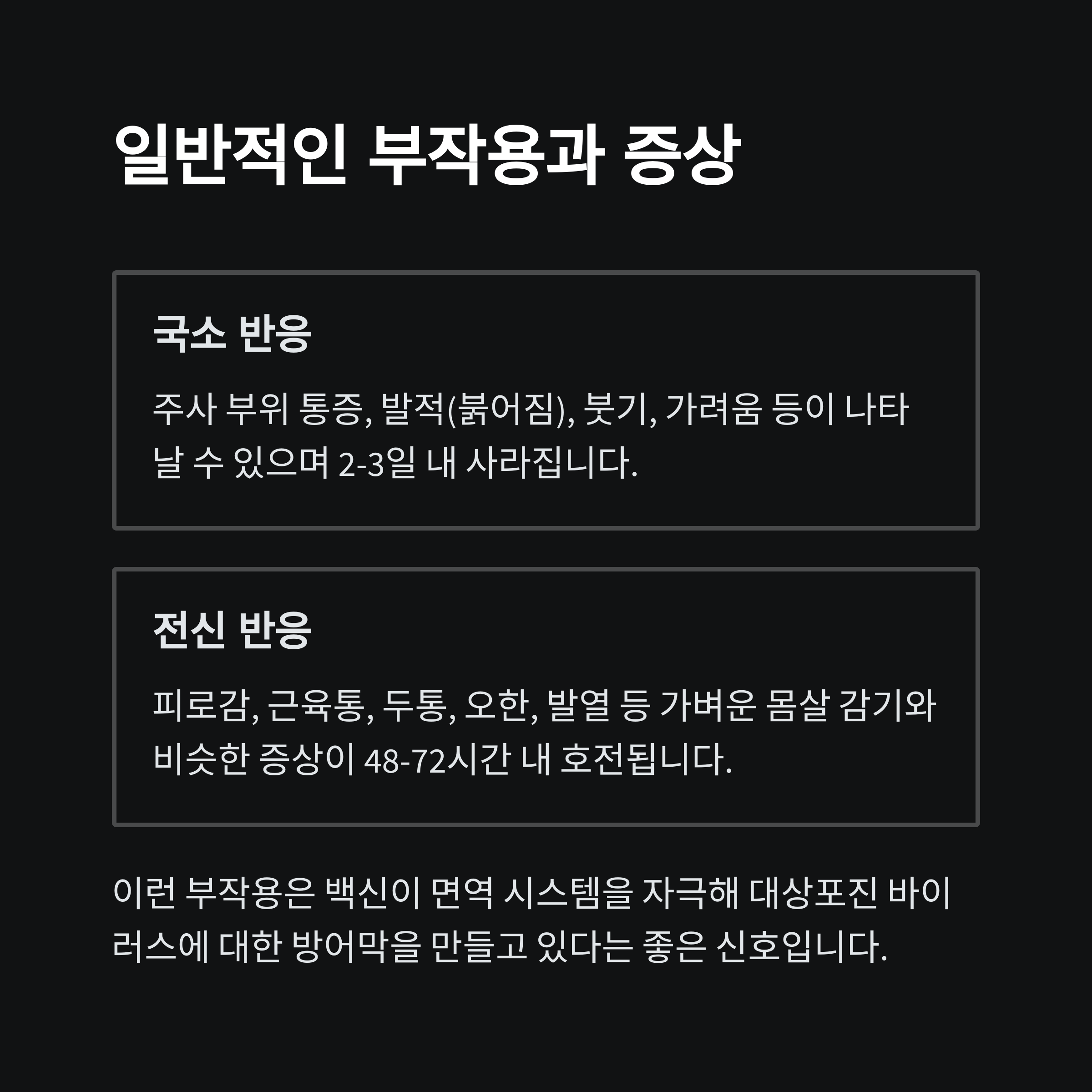 부작용의 강도는 개인차가 있어요. 어떤 분들은 거의 느끼지 못하고 지나가는 반면, 어떤 분들은 좀 더 불편함을 느낄 수 있답니다. 나이, 건강 상태, 면역력 등 여러 요인이 영향을 미치죠. 하지만 대부분은 일상생활에 큰 지장이 없는 수준이에요.